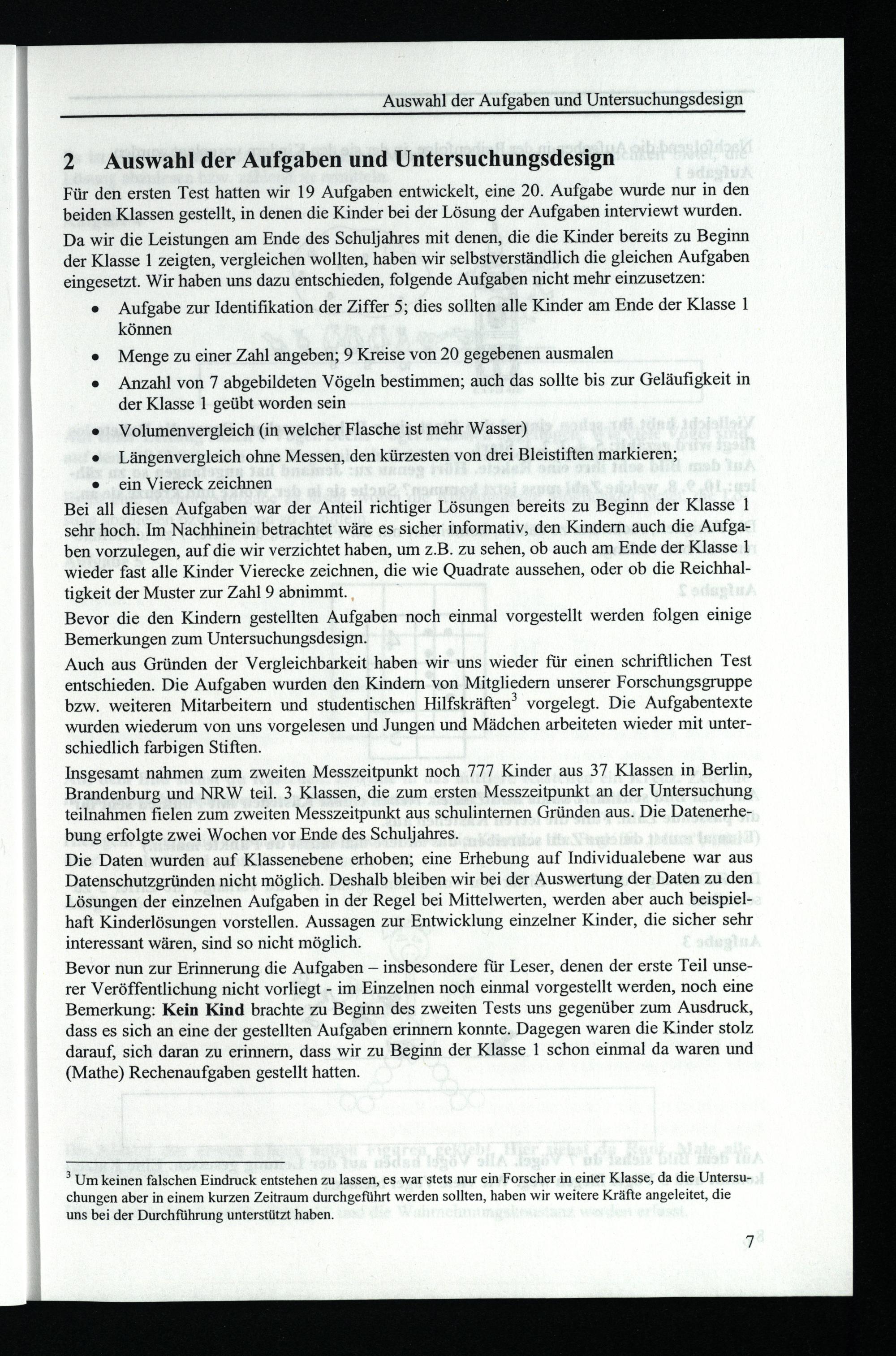 Die Daten wurden auf Klassenebene erhoben; eine Erhebung auf Individualebene war aus Datenschutzgründen nicht möglich. Deshalb bleiben wir bei der Auswertung der Daten zu den Lösungen der einzelnen Aufgaben in der Regel bei Mittelwerten, werden aber auch beispielhaft Kinderlösungen vorstellen. Aussagen zur Entwicklung einzelner Kinder, die sicher sehr interessant wären, sind so nicht möglich.