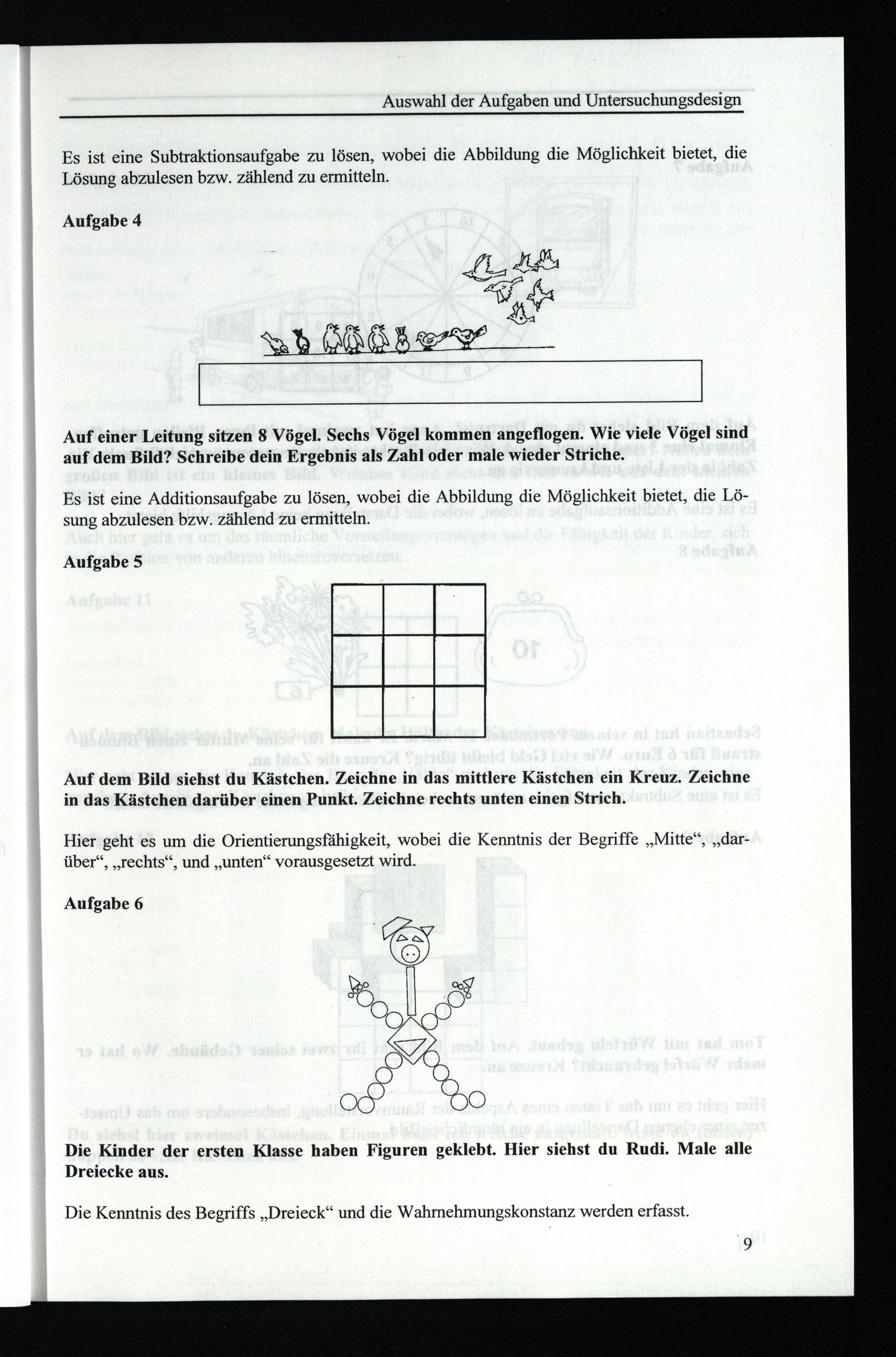 Hier geht es um die Orientierungsfähigkeit, wobei die Kenntnis der Begriffe„Mitte“,„darüber“,„rechts“, und„unten“ vorausgesetzt wird.
