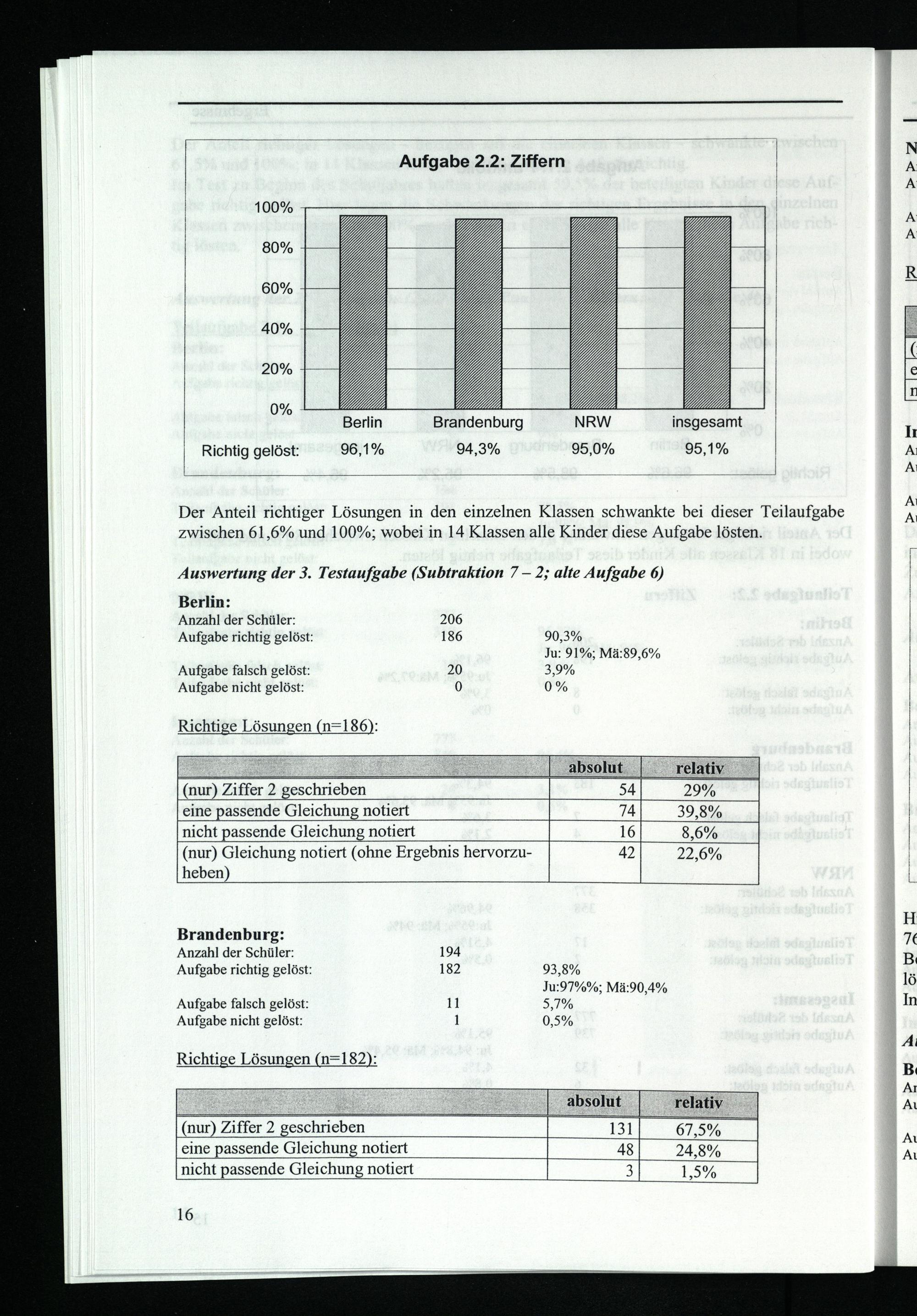 Berlin: Anzahl der Schüler: 206 Aufgabe richtig gelöst: 186 90,3% Ju: 91%; Mä:89,6% Aufgabe falsch gelöst: 20 3,9% Aufgabe nicht gelöst: 0 0%
