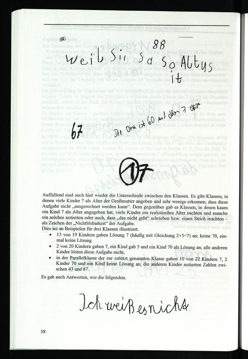 Auffallend sind auch hier wieder die Unterschiede zwischen den Klassen. Es gibt Klassen, in denen viele Kinder 7 als Alter der Großmutter angeben und sehr wenige erkennen, dass diese Aufgabe nicht„ausgerechnet werden kann‘. Dem gegenüber gab es Klassen, in denen kaum ein Kind 7 als Alter angegeben hat, viele Kinder ein realistisches Alter suchten und manche ein solches notierten oder auch, dass„das nicht geht“ schrieben bzw. einen Strich machten— als Zeichen der„Nichtlösbarkeit‘“ der Aufgabe. Dies sei an Beispielen für drei Klassen illustriert. ®° 13 von 19 Kindern gaben Lösung 7(häufig mit Gleichung 2+5=7) an; keine 70, einmal keine Lösung 2 von 20 Kindern gaben 7, ein Kind gab 5 und ein Kind 70 als Lösung an; alle anderen Kinder lösten diese Aufgabe nicht, in der Parallelklasse der zur zuletzt genannten Klasse gaben 10 von 22 Kindern 7, 2 Kinder 70 und ein Kind keine Lösung an, die anderen Kinder notierten Zahlen zwischen 43 und 87.