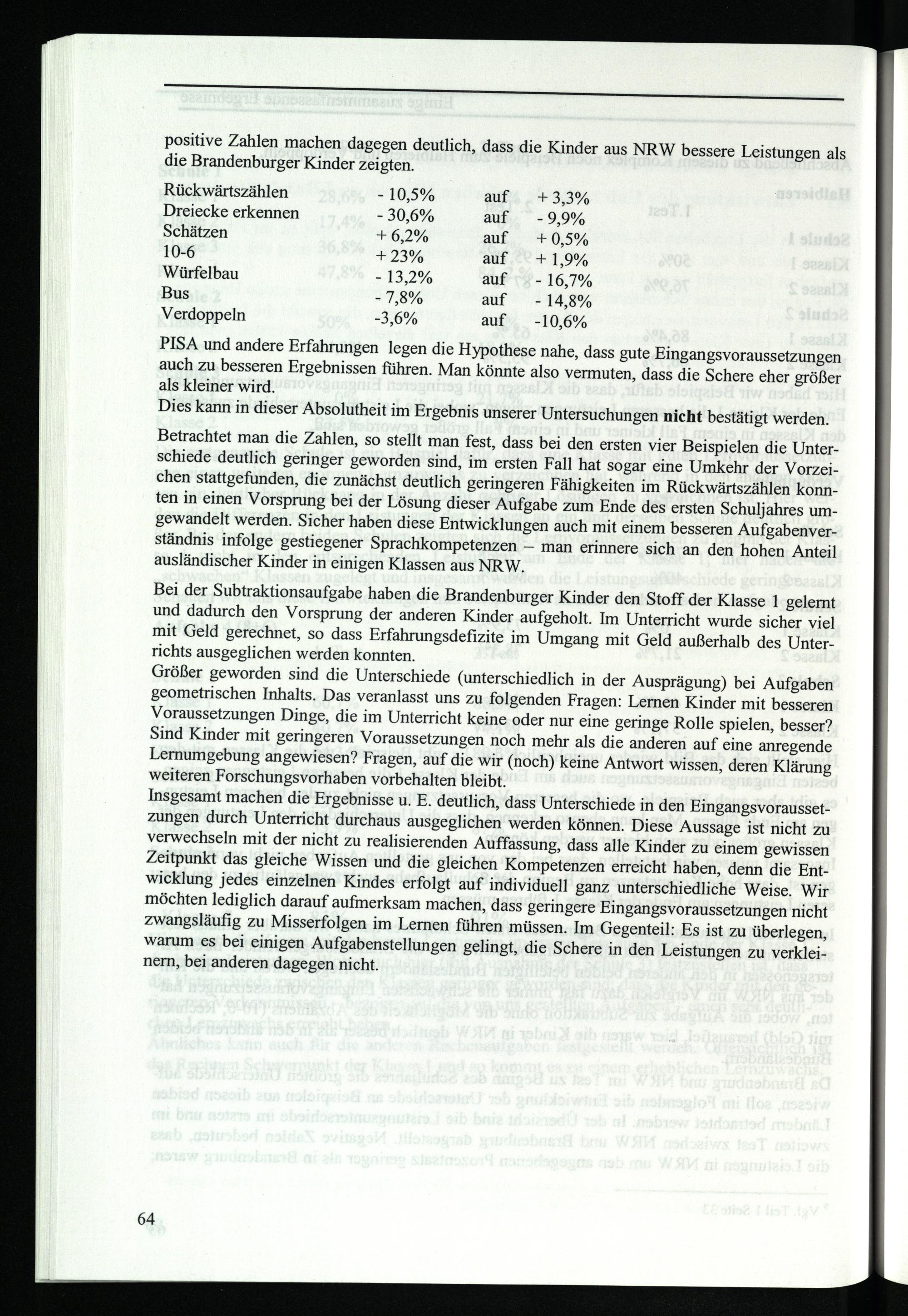 Betrachtet man die Zahlen, so stellt man fest, dass bei den ersten vier Beispielen die Unterschiede deutlich geringer geworden sind, im ersten Fall hat sogar eine Umkehr der Vorzeichen stattgefunden, die zunächst deutlich geringeren Fähigkeiten im Rückwärtszählen konnten in einen Vorsprung bei der Lösung dieser Aufgabe zum Ende des ersten Schuljahres umgewandelt werden. Sicher haben diese Entwicklungen auch mit einem besseren Aufgabenverständnis infolge gestiegener Sprachkompetenzen— man erinnere sich an den hohen Anteil ausländischer Kinder in einigen Klassen aus NRW.