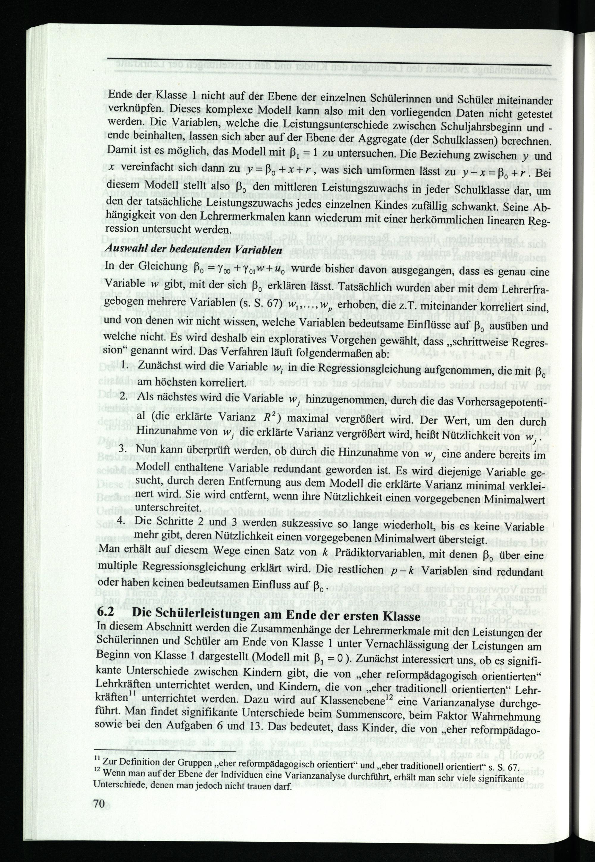Ende der Klasse 1 nicht auf der Ebene der einzelnen Schülerinnen und Schüler miteinander verknüpfen. Dieses komplexe Modell kann also mit den vorliegenden Daten nicht getestet werden. Die Variablen, welche die Leistungsunterschiede zwischen Schuljahrsbeginn und ende beinhalten, lassen sich aber auf der Ebene der Aggregate(der Schulklassen) berechnen. Damit ist es möglich, das Modell mit ß;=1 zu untersuchen. Die Beziehung zwischen y und x vereinfacht sich dann zu y=ß,+x+r, was sich umformen lässt zu y-x=ßi+r. Bei diesem Modell stellt also ß, den mittleren Leistungszuwachs in jeder Schulklasse dar, um den der tatsächliche Leistungszuwachs jedes einzelnen Kindes zufällig schwankt. Seine Abhängigkeit von den Lehrermerkmalen kann wiederum mit einer herkömmlichen linearen Regression untersucht werden. Auswahl der bedeutenden Variablen In der Gleichung ß,= Yo+YoaW+ ug wurde bisher davon ausgegangen, dass es genau eine Variable w gibt, mit der sich ß, erklären lässt. Tatsächlich wurden aber mit dem Lehrerfragebogen mehrere Variablen(s. S. 67) War w,„ erhoben, die z.T. miteinander korreliert sind, und von denen wir nicht wissen, welche Variablen bedeutsame Einflüsse auf ß. ausüben und welche nicht. Es wird deshalb ein exploratives Vorgehen gewählt, dass„schrittweise Regression“ genannt wird. Das Verfahren läuft fol gendermaßen ab: