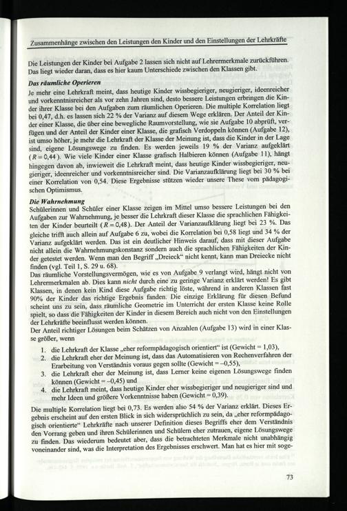 Die multiple Korrelation liegt bei 0,73. Es werden also 54% der Varianz erklärt. Dieses Ergebnis erscheint auf den ersten Blick in sich widersprüchlich zu sein, da„eher reformpädagogisch orientierte“ Lehrkräfte nach unserer Definition dieses Begriffs eher dem Verständnis den Vorrang geben und ihren Schülerinnen und Schülern eher zutrauen, eigene Lösungswege zu finden. Das wiederum bedeutet aber, dass die betrachteten Merkmale nicht unabhängig ind, was die Interpretation des Ergebnisses erschwert. Man hat es hier mit soge