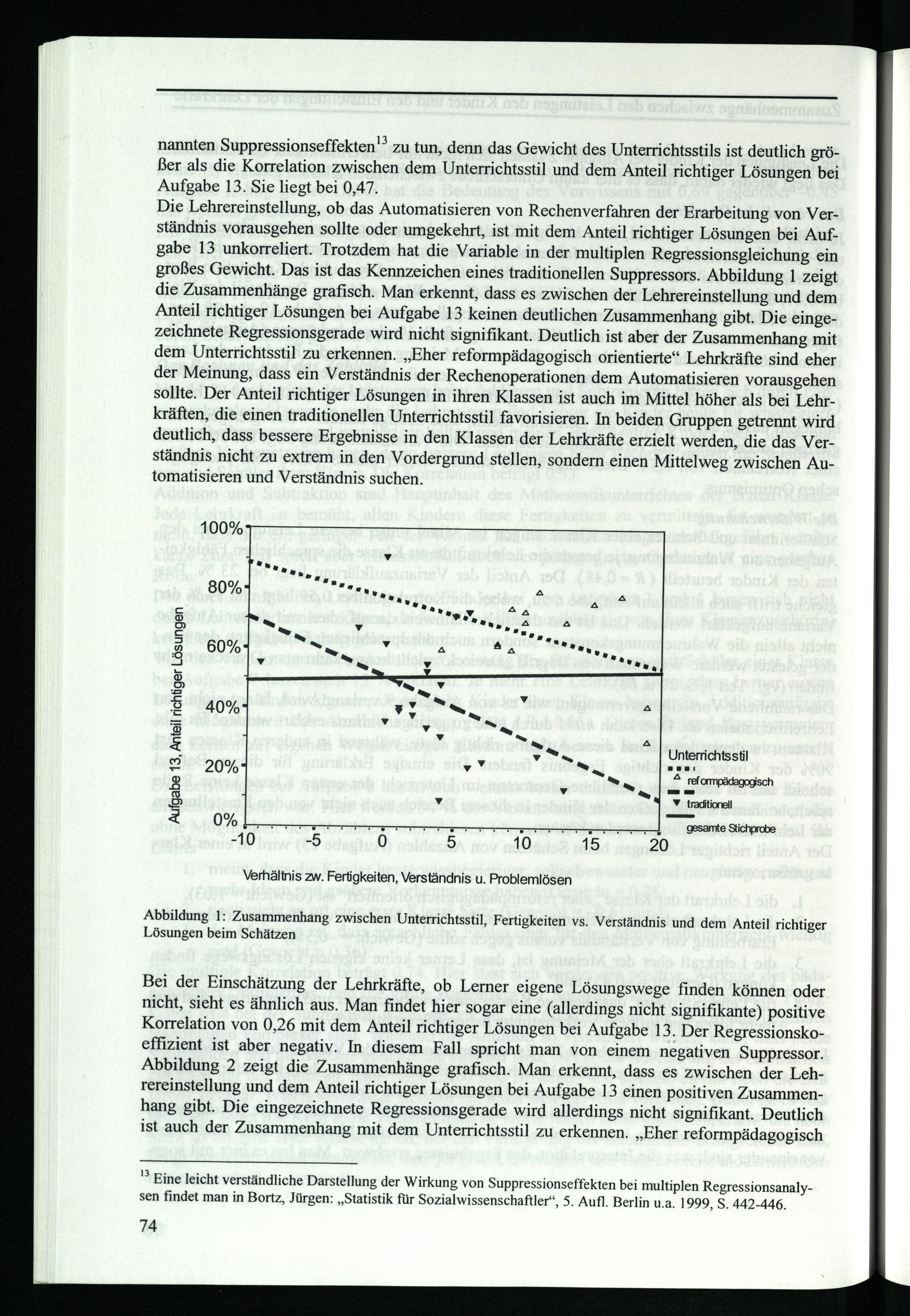 nannten Suppressionseffekten‘* zu tun, denn das Gewicht des Unterrichtsstils ist deutlich größer als die Korrelation zwischen dem Unterrichtsstil und dem Anteil richtiger Lösungen bei Aufgabe 13. Sie liegt bei 0,47.