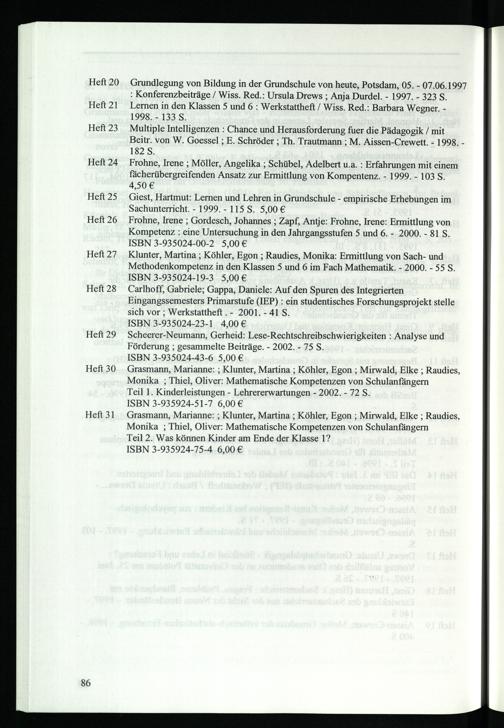 Frohne, Irene; Gordesch, Johannes; Zapf, Antje: Frohne, Irene: Ermittlung von Kompetenz: eine Untersuchung in den Jahrgangsstufen 5 und 6.- 2000.- 81 S. ISBN 3-935024-00-2 5,00€