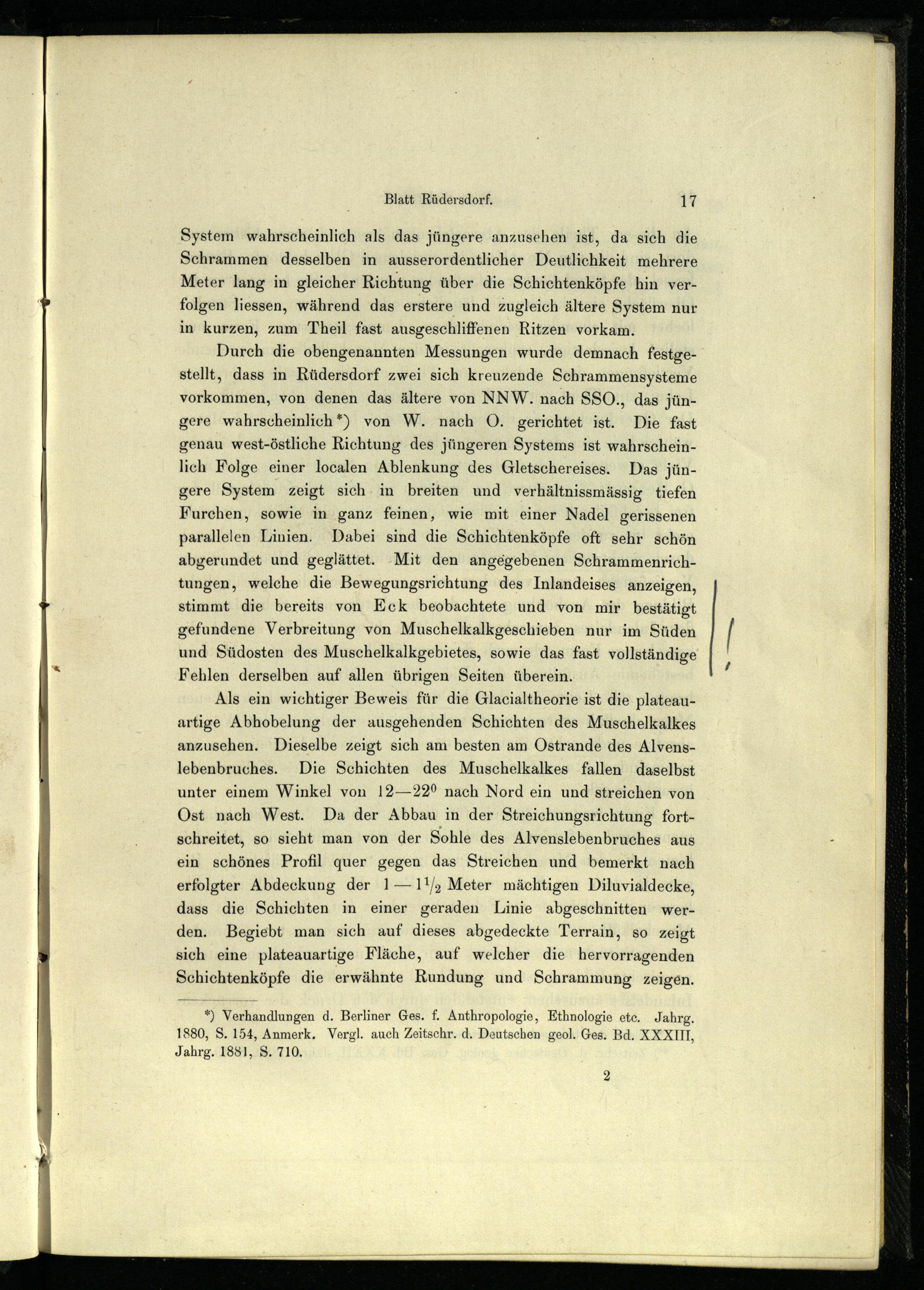 *) Verhandlungen d. Berliner Ges. f. Anthropologie, Ethnologie etc. Jahrg. 1880, S. 154, Anmerk. Vergl. auch Zeitschr. d. Deutschen geol. Ges. Bd. XXXIII, Jahrg. 1881, S. 710.