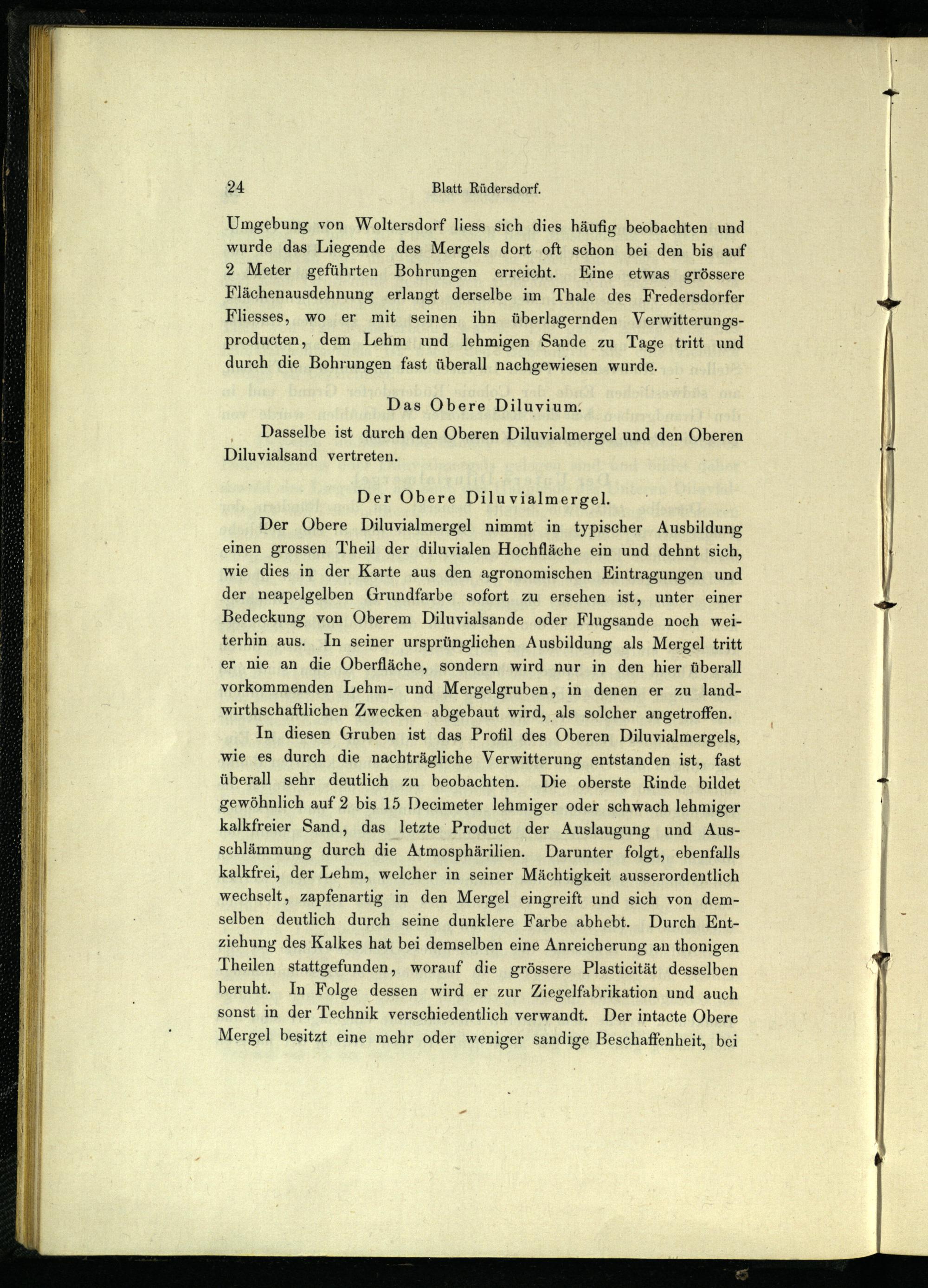 Der Obere Diluvialmergel nimmt in typischer Ausbildung einen grossen Theil der diluvialen Hochfläche ein und dehnt sich, wie dies in der Karte aus den agronomischen Eintragungen und der neapelgelben Grundfarbe sofort zu ersehen ist, unter einer Bedeckung von Oberem Diluvialsande oder Flugsande noch weiterhin aus. In seiner ursprünglichen Ausbildung als Mergel tritt er nie an die Oberfläche, sondern wird nur in den hier überall vorkommenden Lehm- und Mergelgruben, in denen er zu landwirtschaftlichen Zwecken abgebaut wird, als solcher angetroflfen.