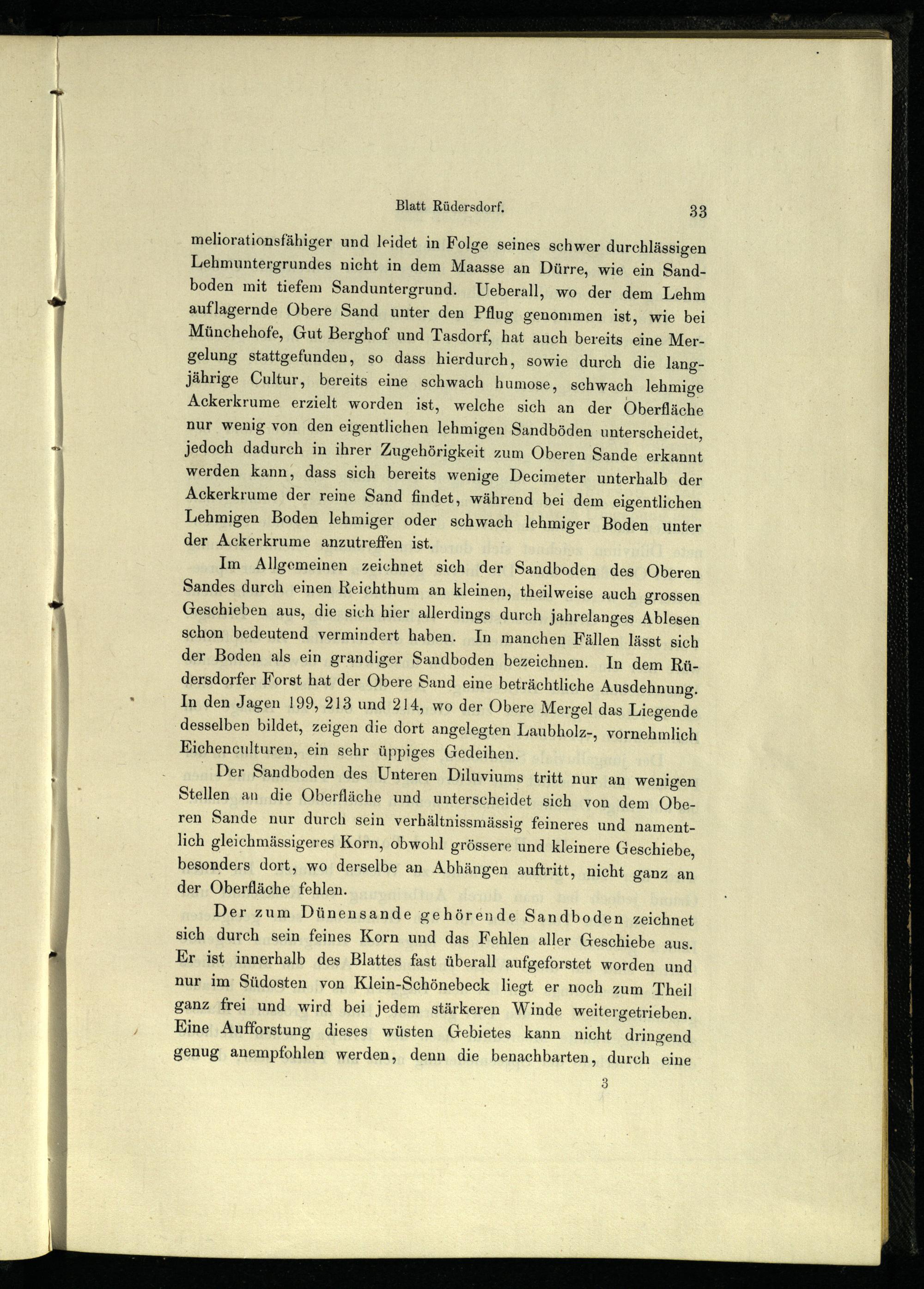 Im Allgemeinen zeichnet sich der Sandboden des Oberen Sandes durch einen Reichthum an kleinen, theilweise auch grossen Geschieben aus, die sich hier allerdings durch jahrelanges Ablesen schon bedeutend vermindert haben. In manchen Fällen lässt sich der Boden als ein grandiger Sandboden bezeichnen. In dem Rü- dersdorfer Forst hat der Obere Sand eine beträchtliche Ausdehnung. In den Jagen 199, 213 und 214, wo der Obere Mergel das Liegende desselben bildet, zeigen die dort angelegten Laubholz-, vornehmlich Eiehenculturen, ein sehr üppiges Gedeihen.