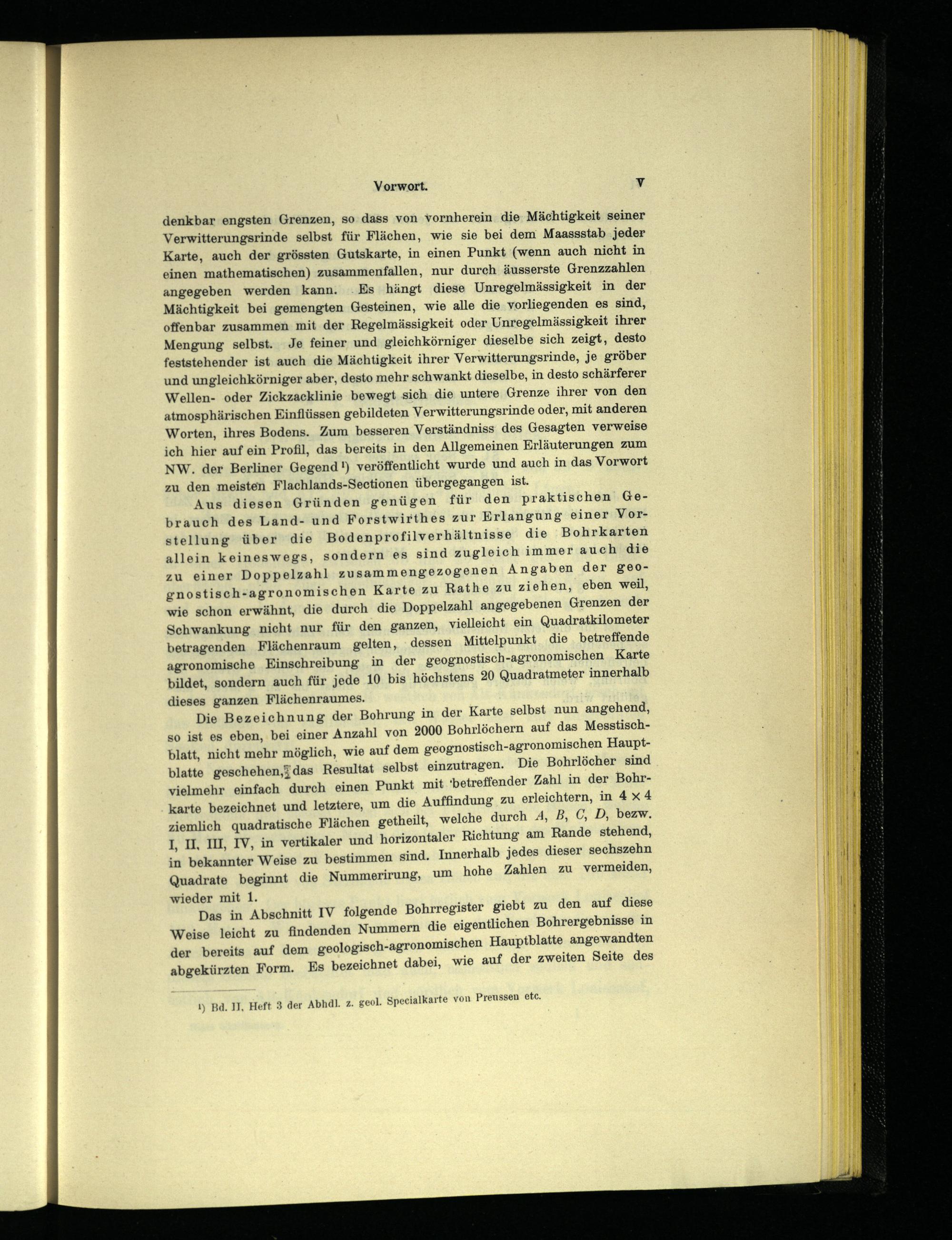 denkbar engsten Grenzen, so dass von vornherein die Mächtigkeit seiner Verwitterungsrinde selbst für Flächen, wie sie bei dem Maassstab jeder Karte, auch der grössten Gutskarte, in einen Punkt (wenn auch nicht in einen mathematischen) zusammenfallen, nur durch äusserste Grenzzahlen angegeben werden kann. Es hängt diese Unregelmässigkeit in der Mächtigkeit bei gemengten Gesteinen, wie alle die vorliegenden es sind, offenbar zusammen mit der Regelmässigkeit oder Unregelmässigkeit ihrer Mengung selbst. Je feiner und gleichkörniger dieselbe sich zeigt, desto feststehender ist auch die Mächtigkeit ihrer Verwitterungsrinde, je gröber und ungleichkörniger aber, desto mehr schwankt dieselbe, in desto schärferer Wellen- oder Zickzacklinie bewegt sich die untere Grenze ihrer von den atmosphärischen Einflüssen gebildeten Verwitterungsrinde oder, mit anderen Worten, ihres Bodens. Zum besseren Verständniss des Gesagten verweise ich hier auf ein Profil, das bereits in den Allgemeinen Erläuterungen zum NW. der Berliner Gegend 1 ) veröffentlicht wurde und auch in das Vorwort zu den meisten Flachlands-Sectionen übergegangen ist.