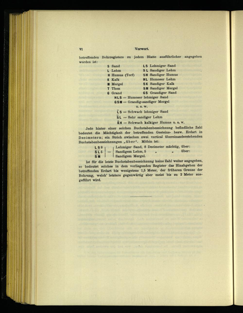 Ist für die letzte Buchstabenbezeichnung keine Zahl weiter angegeben, so bedeutet solches in dem vorliegenden Register das Hinabgehen der betreffenden Erdart bis wenigstens 1,6 Meter, der früheren Grenze der Bohrung, welch* letztere gegenwärtig aber meist bis zu 2 Meter ausgeführt wird.