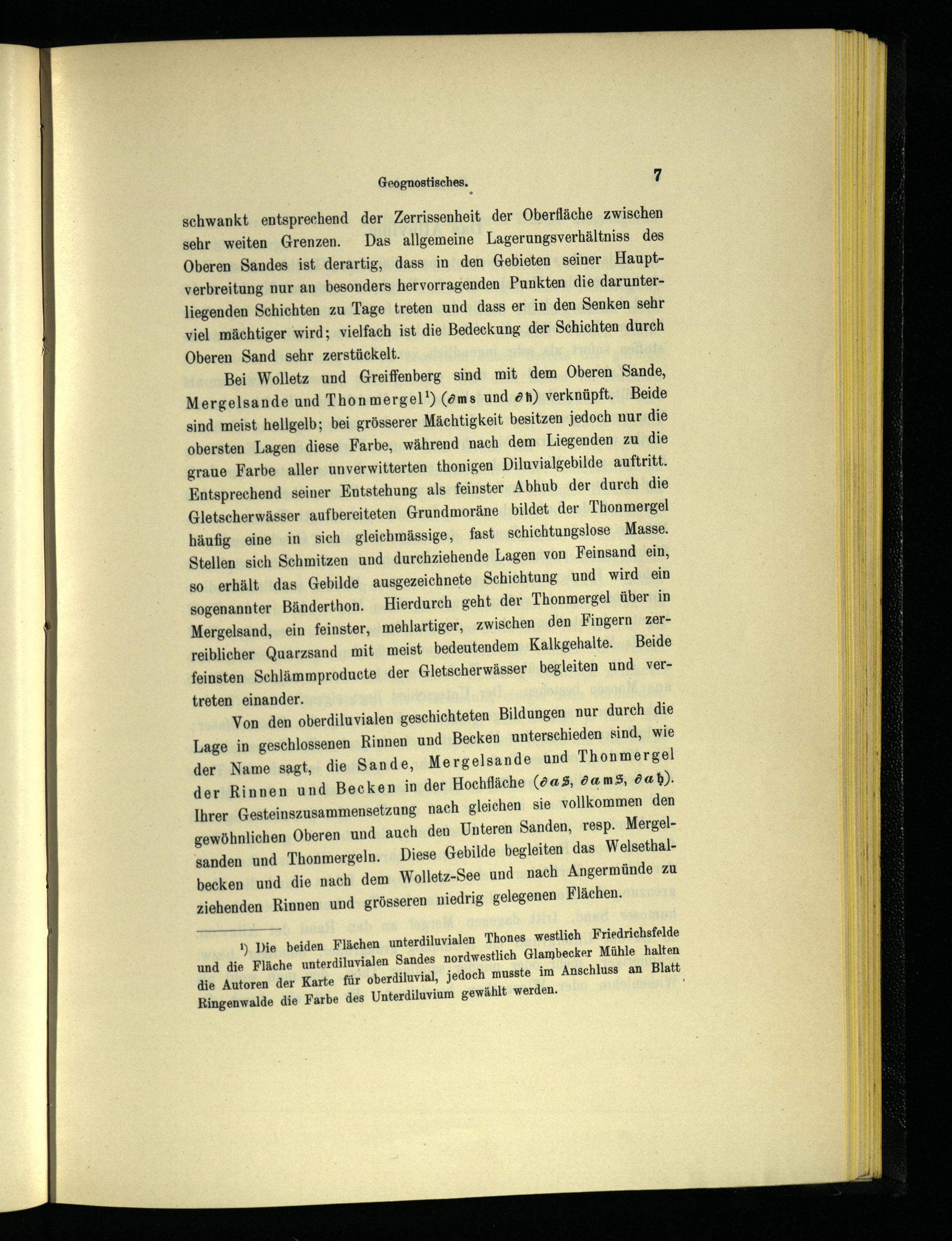 Bei Wolletz und Greiffenberg sind mit dem Oberen Sande, Mergelsande und Thonmergel 1 ) (<?ms und <9h) verknüpft. Beide sind meist hellgelb; bei grösserer Mächtigkeit besitzen jedoch uur die obersten Lagen diese Farbe, während nach dem Liegenden zu die graue Farbe aller unverwitterten thonigen Diluvialgebilde auftritt. Entsprechend seiner Entstehung als feinster Abhub der durch die Gletscherwässer aufbereiteten Grundmoräne bildet der Thonmergel häufig eine in sich gleicbmässige, fast schichtungslose Masse. Stellen sich Schmitzen und durchziehende Lagen von Feinsand ein, so erhält das Gebilde ausgezeichnete Schichtung und wird ein sogenannter Bänderthon. Hierdurch geht der Thonmergel über in Mergelsand, ein feinster, mehlartiger, zwischen den Fingern zer- reiblicher Quarzsand mit meist bedeutendem Kalkgehalte. Beide feinsten Schlämmproducte der Gletscherwässer begleiten und vertreten einander.