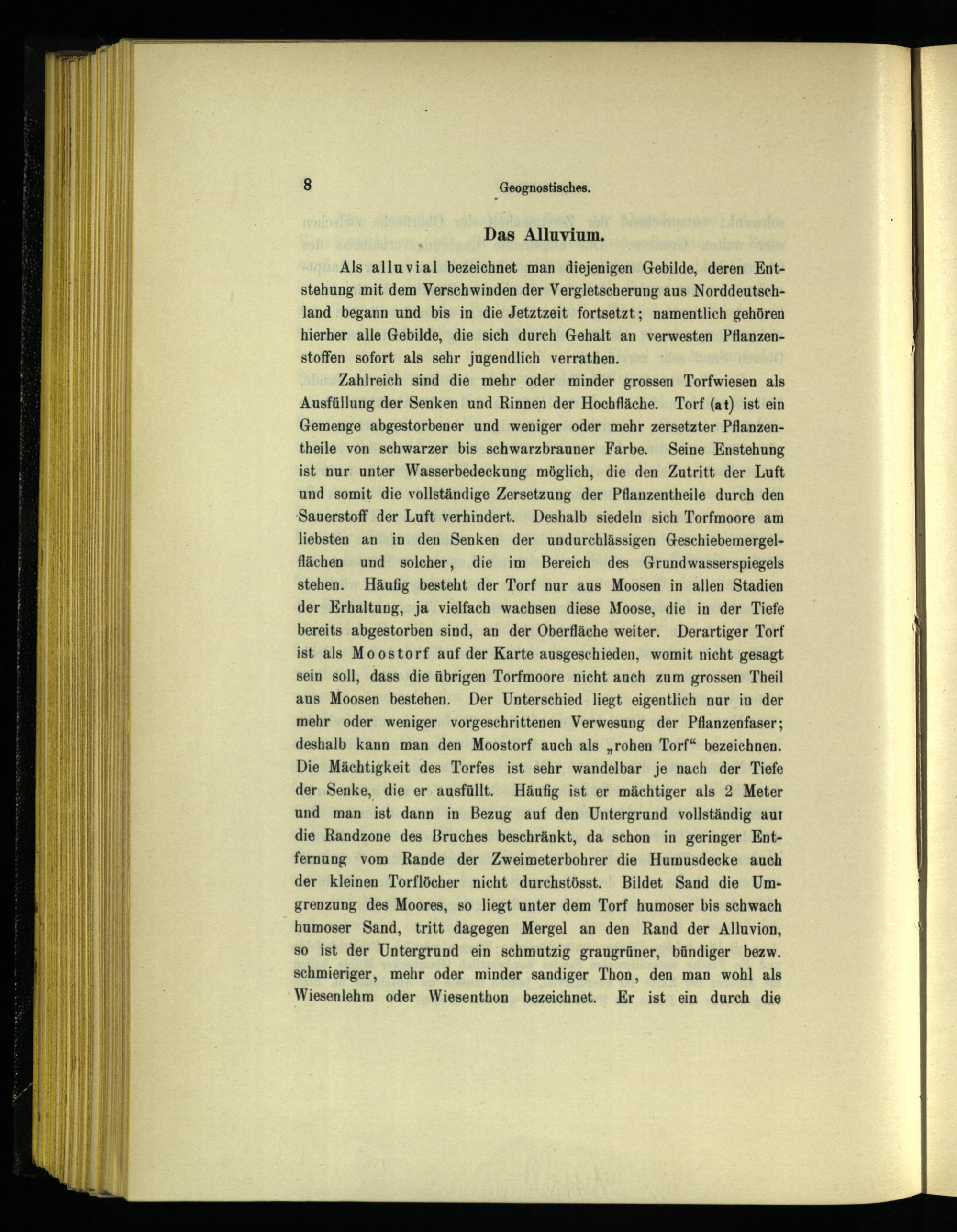 Als alluvial bezeichnet man diejenigen Gebilde, deren Entstehung mit dem Verschwinden der Vergletscherung aus Norddeutschland begann und bis in die Jetztzeit fortsetzt; namentlich gehöreu hierher alle Gebilde, die sich durch Gehalt an verwesten Pflanzenstoffen sofort als sehr jugendlich verrathen.