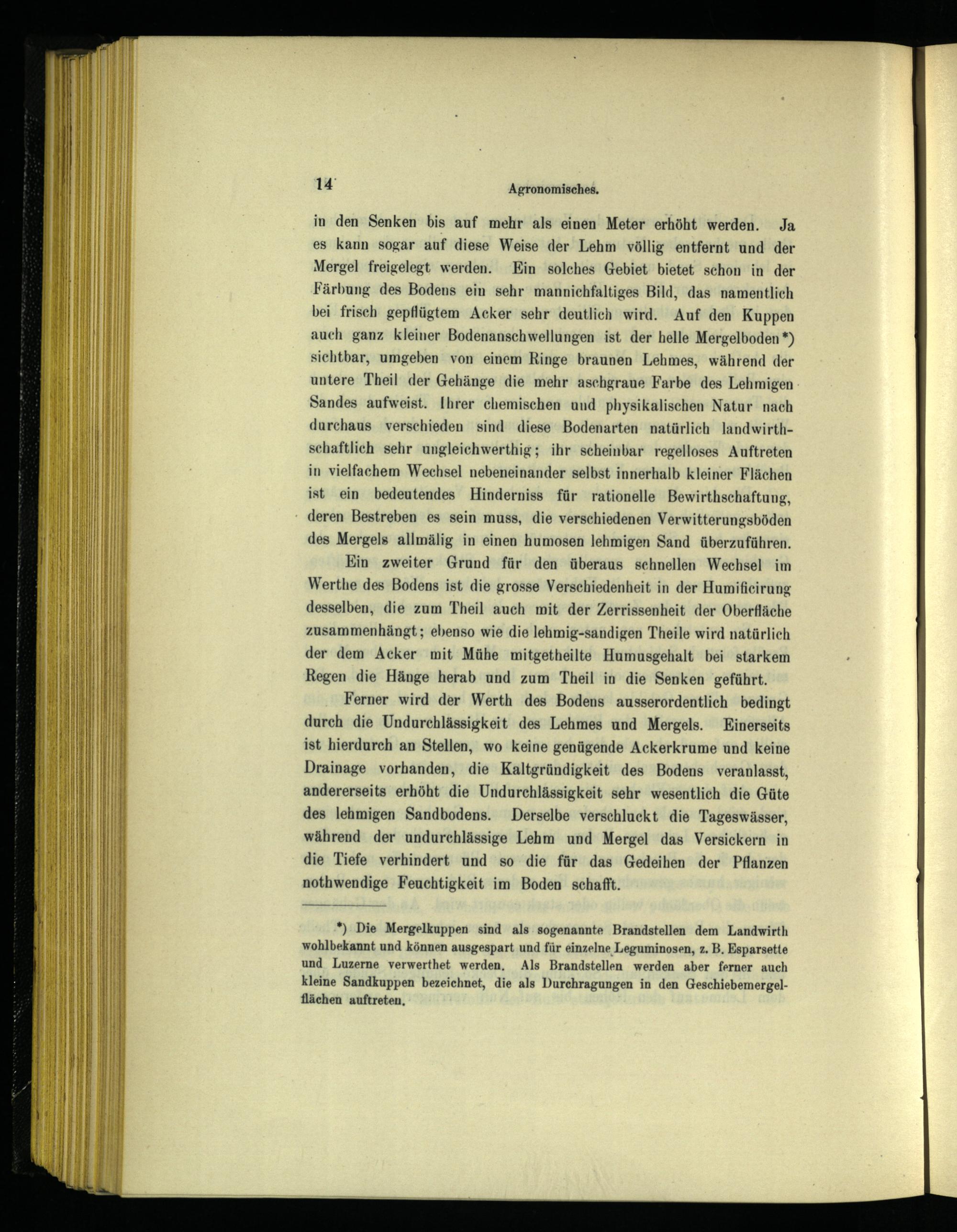 in den Senken bis auf mehr als einen Meter erhöht werden. Ja es kann sogar auf diese Weise der Lehm völlig entfernt und der Mergel freigelegt werden. Ein solches Gebiet bietet schon in der Färbung des Bodens ein sehr mannichfaltiges Bild, das namentlich bei frisch gepflügtem Acker sehr deutlich wird. Auf den Kuppen auch ganz kleiner Bodenanschwellungen ist der helle Mergelboden*) sichtbar, umgeben von einem Ringe braunen Lehmes, während der untere Theil der Gehänge die mehr aschgraue Farbe des Lehmigen Sandes aufweist. Ihrer chemischen und physikalischen Natur nach durchaus verschieden sind diese Bodenarten natürlich landwirth- schaftlich sehr ungleichwerthig; ihr scheinbar regelloses Auftreten in vielfachem Wechsel nebeneinander selbst innerhalb kleiner Flächen ist ein bedeutendes Hinderniss für rationelle Bewirthschaftung, deren Bestreben es sein muss, die verschiedenen Verwitterungsböden des Mergels allmälig in einen humosen lehmigen Sand überzuführen.