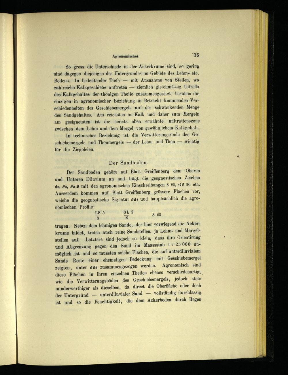 Der Sandboden gehört auf Blatt Greiffenberg dem Oberen und Unteren Diluvium an und trägt die geognostisehen Zeichen d8, <?s, da SS mit den agronomischen Einschreibungen S 20, GS 20 etc. Ausserdem kommen auf Blatt Greiffenberg grössere Flächen vor, welche die geognostische Signatur dds und hauptsächlich die agronomischen Profile: