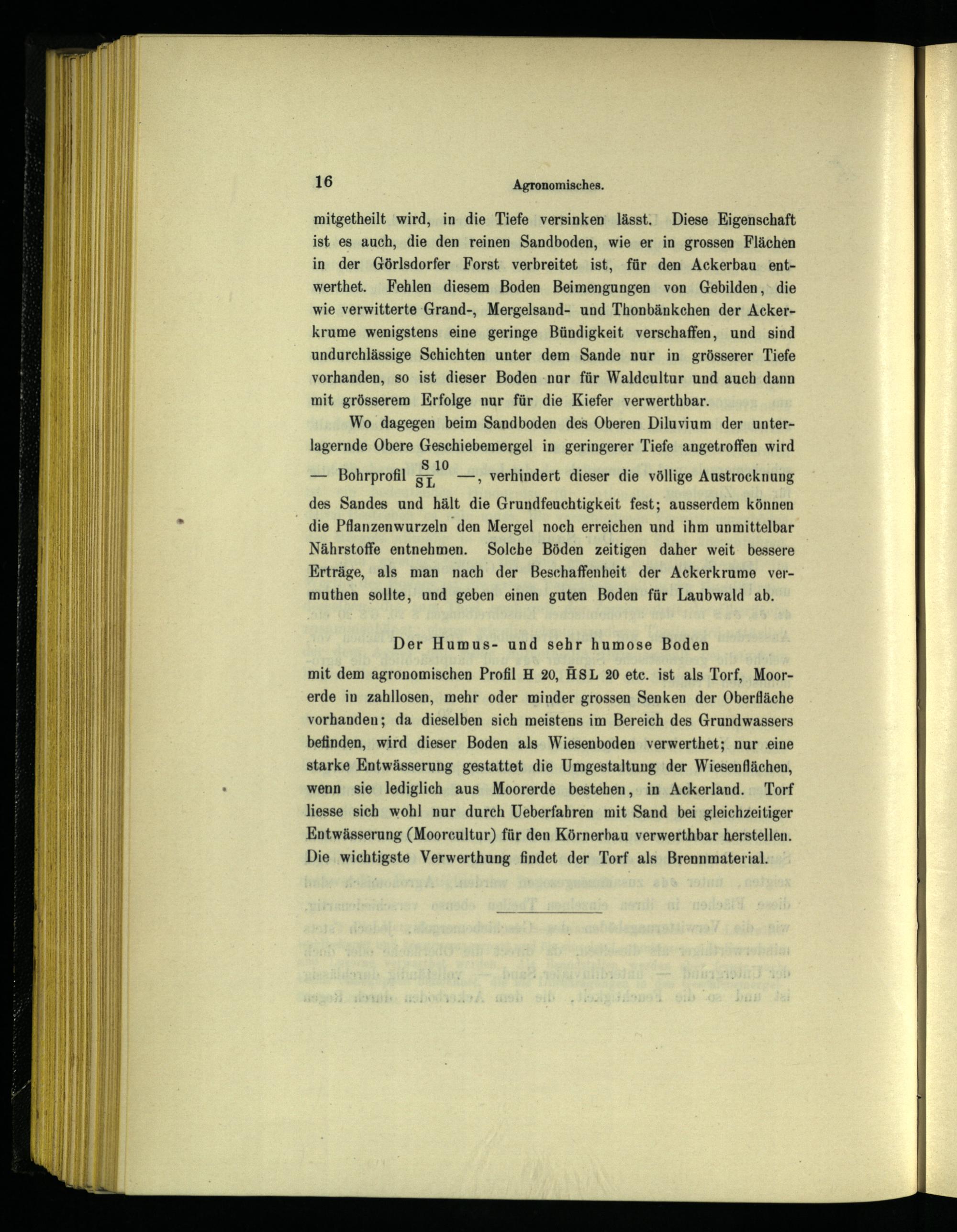 mit dem agronomischen Profil H 20, HSL 20 etc. ist als Torf, Moorerde in zahllosen, mehr oder minder grossen Senken der Oberfläche vorhanden; da dieselben sich meistens im Bereich des Grundwassers befinden, wird dieser Boden als Wiesenboden verwerthet; nur eine starke Entwässerung gestattet die Umgestaltung der Wiesenflächen, wenn sie lediglich aus Moorerde bestehen, in Ackerland. Torf liesse sich wohl nur durch Ueberfahren mit Sand bei gleichzeitiger Entwässerung (Moorcultur) für den Körnerbau verwerthbar herstellen. Die wichtigste Verwerthung findet der Torf als Brennmaterial.