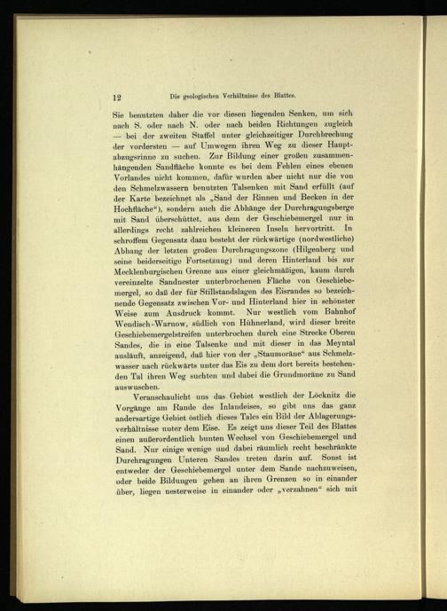 Sie benutzten daher die vor diesen liegenden Senken, um sich nach S. oder nach N. oder nach beiden Richtungen zugleich — bei der zweiten Staffel unter gleichzeitiger Durchbrechung der vordersten — auf Umwegen ihren Weg zu dieser Haupt- abzugsrinne zu suchen. Zur Bildung einer großen zusammenhängenden Sandfläche konnte es bei dem Fehlen eines ebenen Vorlandes nicht kommen, dafür wurden aber nicht nur die von den Schmelzwassern benutzten Talsenken mit Sand erfüllt (auf der Karte bezeichnet als „Sand der Rinnen und Becken in der Hochfläche“)» sondern auch die Abhänge der Durchragungsberge mit Sand überschüttet, aus dem der Geschiebemergel nur in allerdings recht zahlreichen kleineren Inseln hervortritt. In schroffem Gegensatz dazu besteht der rückwärtige (nordwestliche) Abhang der letzten großen Durchragungszone (Hilgenberg und seine beiderseitige Fortsetzung) und deren Hinterland bis zur Mecklenburgischen Grenze aus einer gleichmäßigen, kaum durch vereinzelte Sandnester unterbrochenen Fläche von Geschiebemergel, so daß der für Stillstandslagen des Eisrandes so bezeichnende Gegensatz zwischen Vor- und Hinterland hier in schönster Weise zum Ausdruck kommt. Nur westlich vom Bahnhof Wendisch-Warnow , südlich von Hühnerland, wird dieser breite Geschiebemergelstreifen unterbrochen durch eine Strecke Oberen Sandes, die in eine Talsenke und mit dieser in das Meyntal ausläuft, anzeigend, daß hier von der „Staumoräne“ aus Schmelzwasser nach rückwärts unter das Eis zu dem dort bereits bestehenden Tal ihren Weg suchten und dabei die Grundmoräne zu Sand auswuschen.