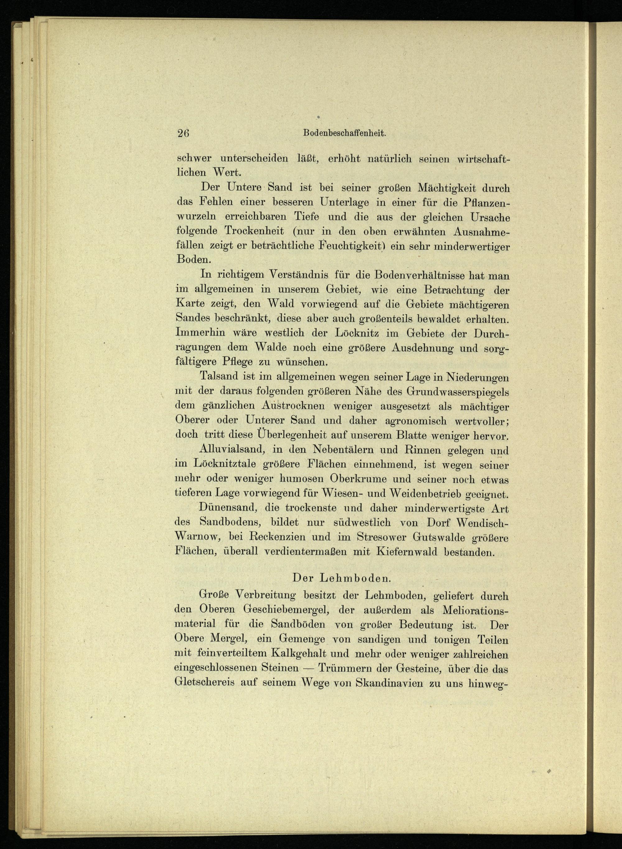 Der Untere Sand ist hei seiner großen Mächtigkeit durch das Fehlen einer besseren Unterlage in einer für die Pflanzen- wurzeln erreichbaren Tiefe und die aus der gleichen Ursache folgende Trockenheit (nur in den oben erwähnten Ausnahmefällen zeigt er beträchtliche Feuchtigkeit) ein sehr minderwertiger Boden.
