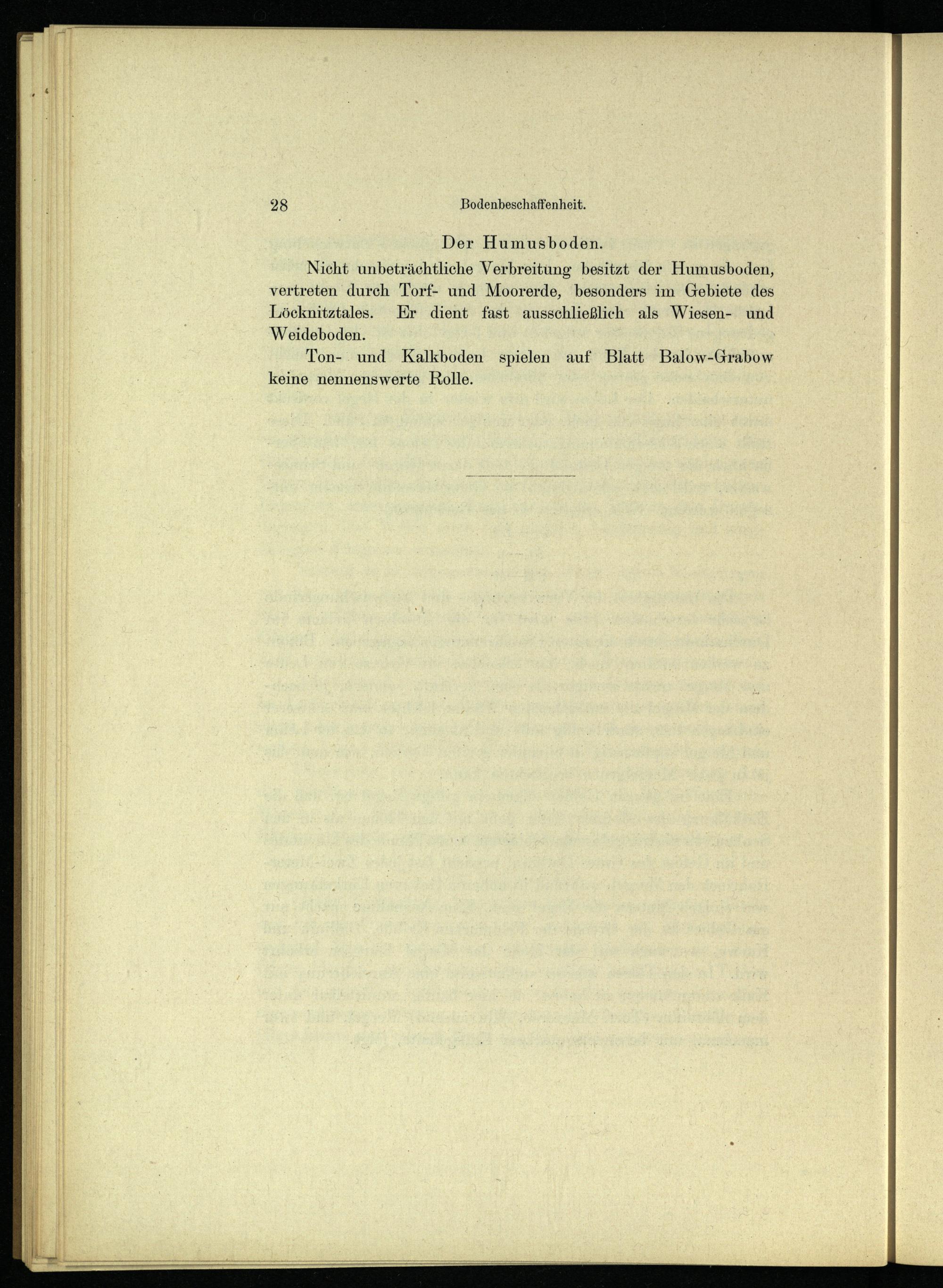 Nicht unbeträchtliche Verbreitung besitzt der Humusboden, vertreten durch Torf- und Moorerde, besonders im Gebiete des Löcknitztales. Er dient fast ausschließlich als Wiesen- und Weideboden.