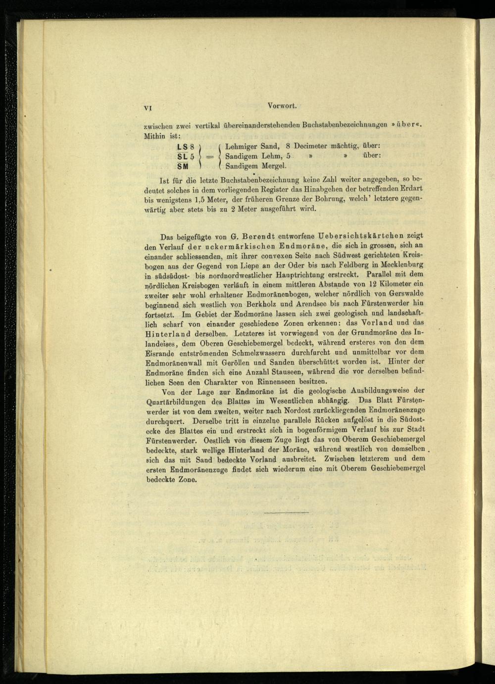 Von der Lage zur Endmoräne ist die geologische Ausbildungsweise der Quartärbildungen des Blattes im Wesentlichen abhängig. Das Blatt Fürsten werder ist von dem zweiten, weiter nach Nordost zurückliegenden Endmoränenzugo durchquert. Derselbe tritt in einzelne parallele Rücken aufgelöst in die Südostecke des Blattes ein und erstreckt sich in bogenförmigem Verlauf bis zur Stadt Fürstenwerder . Oestlich von diesem Zuge liegt das von Oberem Geschiebemergel bedeckte, stark wellige Hinterland der Moräne, während westlich von demselben sich das mit Sand bedeckte Vorland ausbreitet. Zwischen letzterem und dem ersten Endmoränenzuge findet sich wiederum eine mit Oberem Geschiebemergel bedeckte Zone.