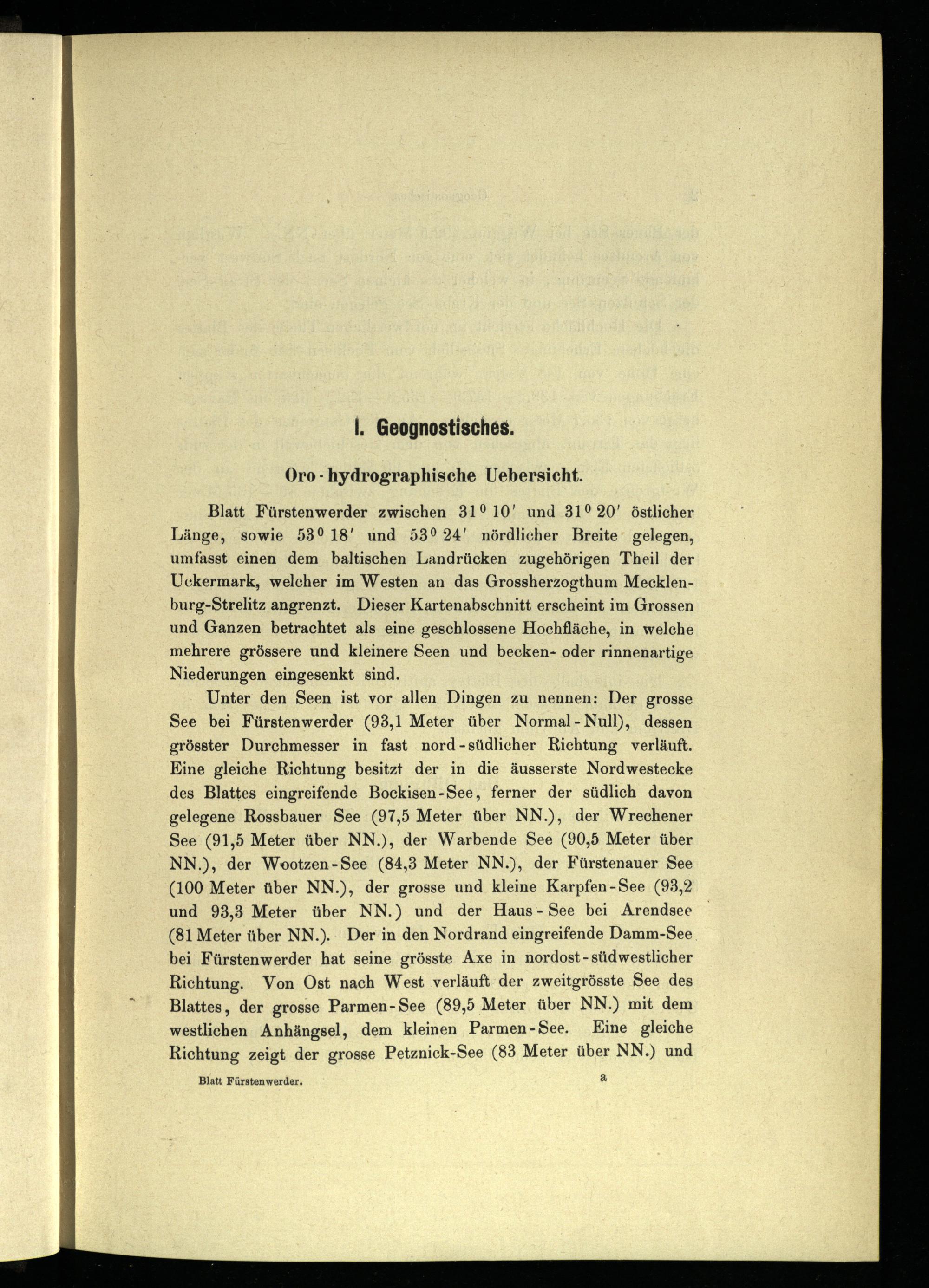 Blatt Fürstenwerder zwischen 31° 10' und 31° 20’ östlicher Länge, sowie 53° 18' und 53° 24' nördlicher Breite gelegen, umfasst einen dem baltischen Landrücken zugehörigen Theil der Uckermark, welcher im Westen an das Grossherzogthum Mecklen- burg-Strelitz angrenzt. Dieser Kartenabschnitt erscheint im Grossen und Ganzen betrachtet als eine geschlossene Hochfläche, in welche mehrere grössere und kleinere Seen und becken- oder rinnenartige Niederungen eingesenkt sind.