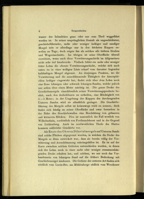wasser des Inlandeises ganz oder nur zum Theil weggeführt worden ist. In seiner ursprünglichen Gestalt als ungeschichteter, geschiebeführender, mehr oder weniger kalkiger und sandiger Mergel tritt er allerdings nur in den höchsten Kuppen zuweilen zu Tage, doch zeigen ihn als solchen alle tieferen Gruben und Wegeeinschnitte. Im übrigen ist seine Oberfläche überall verwittert, wenn auch diese Verwitterungsschicht im Allgemeinen nicht sehr tief hinabreicht. Vielfach bildet ein mehr oder weniger fetter Lehm die oberste Verwitterungsschicht, welche sich nach unten zu in einer welligen Linie scharf vom darunter liegenden kalkhaltigen Mergel abgrenzt. An denjenigen Punkten, wo die Verwitterung und die ausschlämmende Thätigkeit der Atmosphärilien heftiger eingewirkt hat, findet sich über dem Lehm noch eine Zone lehmigen oder schwach lehmigen Sandes, welche jedoch nur selten über einen Meter mächtig ist. Die ganze Decke des Geschiebemergels einschliesslich seiner Verwitterungsproducte besitzt, nach den Aufschlüssen zu urtheilen, eine Mächtigkeit von 4—5 Meter; in der Umgebung der Kuppen des durchragenden Unteren Sandes wird sie allmählich geringer. Die Geschiebeführung des Mergels selbst ist keineswegs reich zu nennen, doch findet sich häufig an seiner Oberfläche und zwar besonders in der Nähe des Geschiebewalles eine Beschüttung von grösseren und kleineren Blöcken. Dies ist namentlich der Fall westlich von Wilhelmshain, nordöstlich von Ferdinandshorst und in der Gegend von Lichtenberg. Auch im nordwestlichen Theile des Blattes kommen zahlreiche Geschiebe vor.