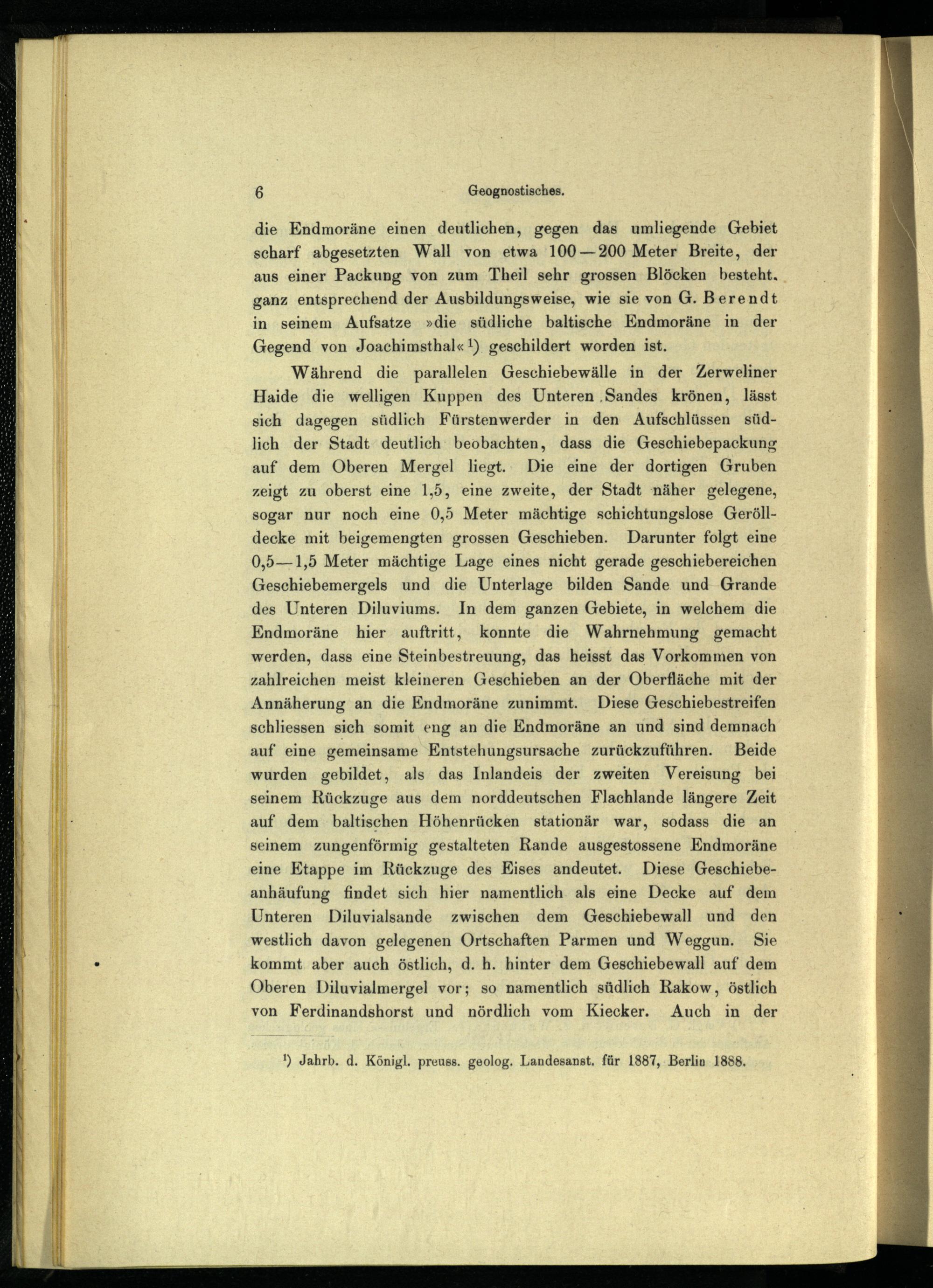die Endmoräne einen deutlichen, gegen das umliegende Gebiet scharf abgesetzten Wall von etwa 100 — 200 Meter Breite, der aus einer Packung von zum Theil sehr grossen Blöcken besteht, ganz entsprechend der Ausbildungsweise, wie sie von G. Berendt in seinem Aufsatze »die südliche baltische Endmoräne in der Gegend von Joachimsthal « x ) geschildert worden ist.