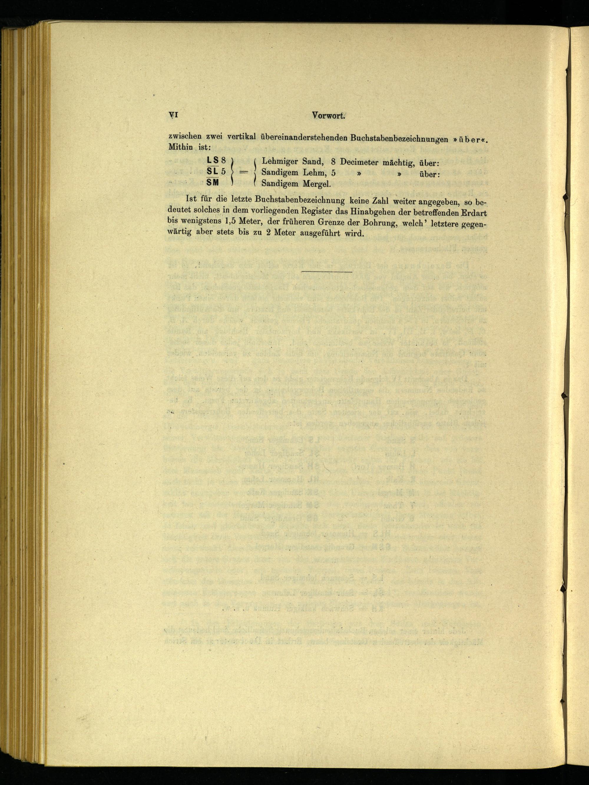 Ist für die letzte Buchstabenbezeichnung keine Zahl weiter angegeben, so bedeutet solches in dem vorliegenden Register das Hinabgehen der betreffenden Erdart bis wenigstens 1,5 Meter, der früheren Grenze der Bohrung, welch’ letztere gegenwärtig aber stets bis zu 2 Meter ausgeführt wird.