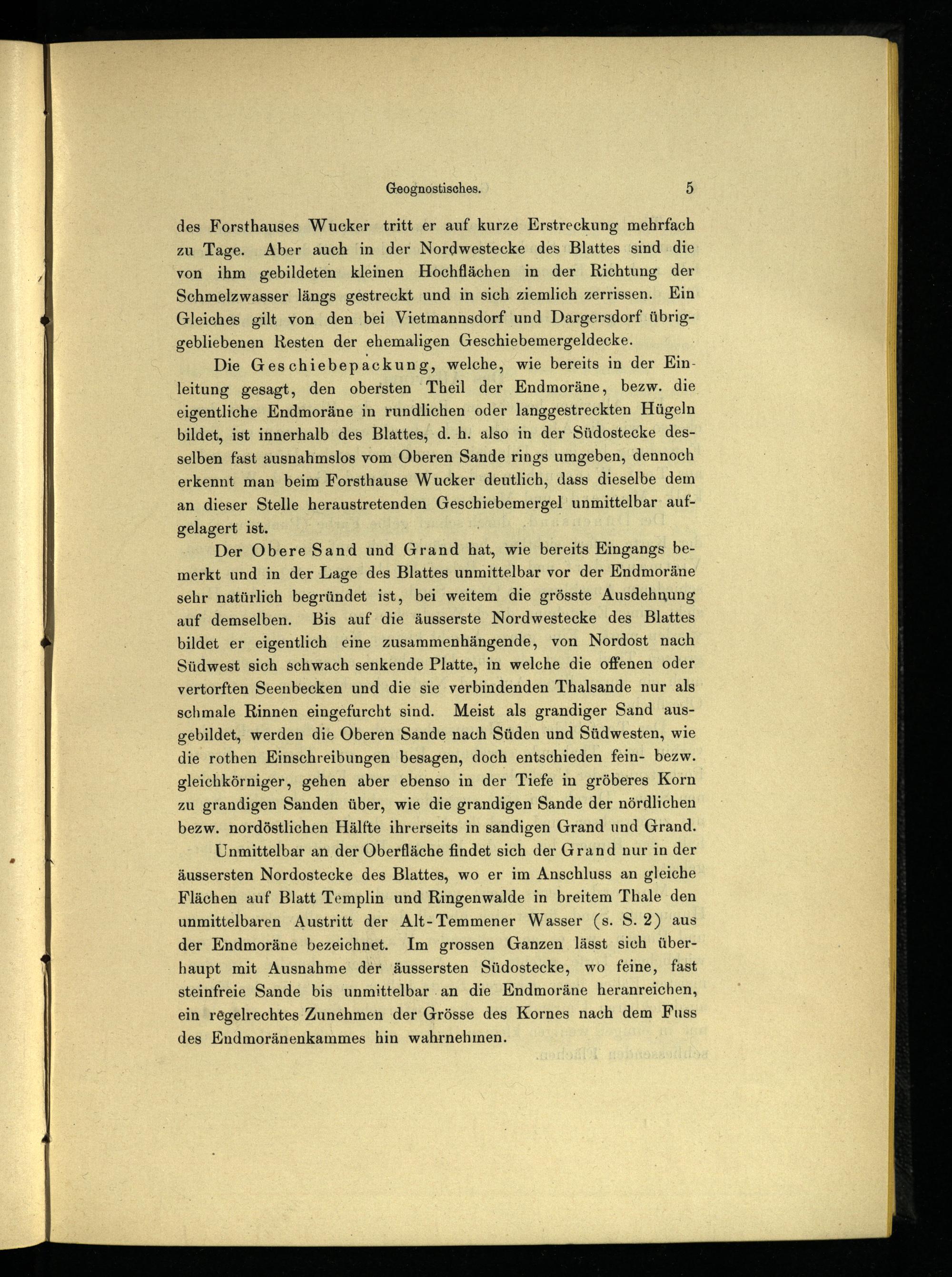 Unmittelbar an der Oberfläche findet sich der Grand nur in der äussersten Nordostecke des Blattes, wo er im Anschluss an gleiche Flächen auf Blatt Templin und Ringenwalde in breitem Thale den unmittelbaren Austritt der Alt-Temmener Wasser (s. S. 2) aus der Endmoräne bezeichnet. Im grossen Ganzen lässt sich überhaupt mit Ausnahme der äussersten Südostecke, wo feine, fast steinfreie Sande bis unmittelbar an die Endmoräne heranreichen, ein regelrechtes Zunehmen der Grösse des Kornes nach dem Fuss des Endmoränenkammes hin wahrnehmen.