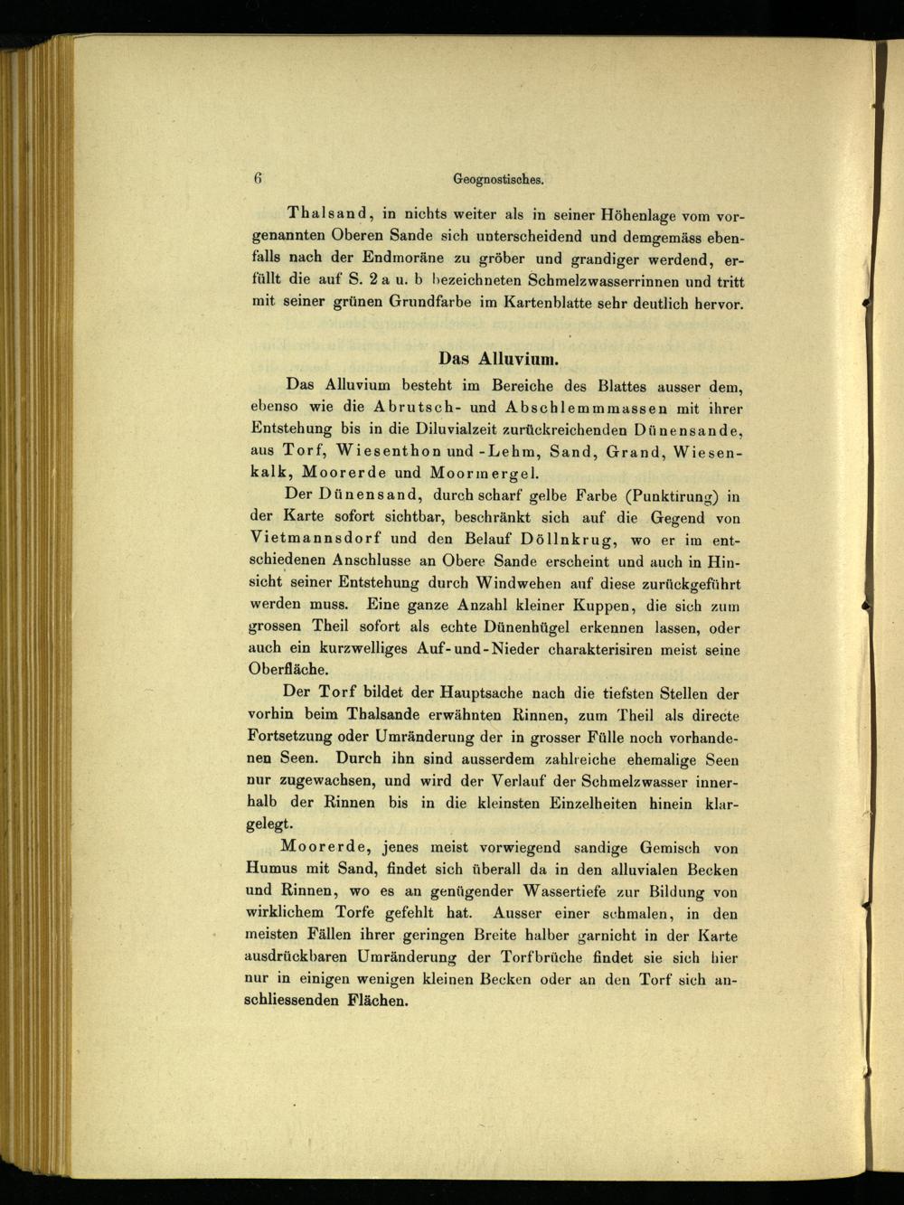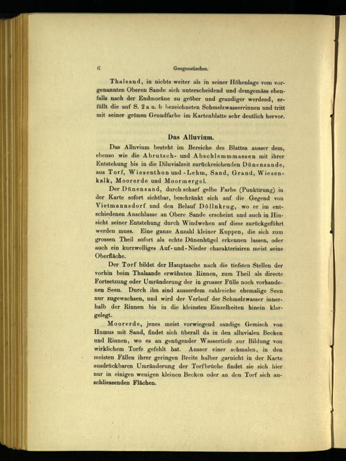 Das Alluvium besteht im Bereiche des Blattes ausser dem, ebenso wie die Abrutsch- und Abschlemmmassen mit ihrer Entstehung bis in die Diluvialzeit zurückreichenden Dünensande, aus Torf, Wiesenthon und -Lehm, Sand, Grand, Wiesenkalk, Moorerde und Moormergel.
