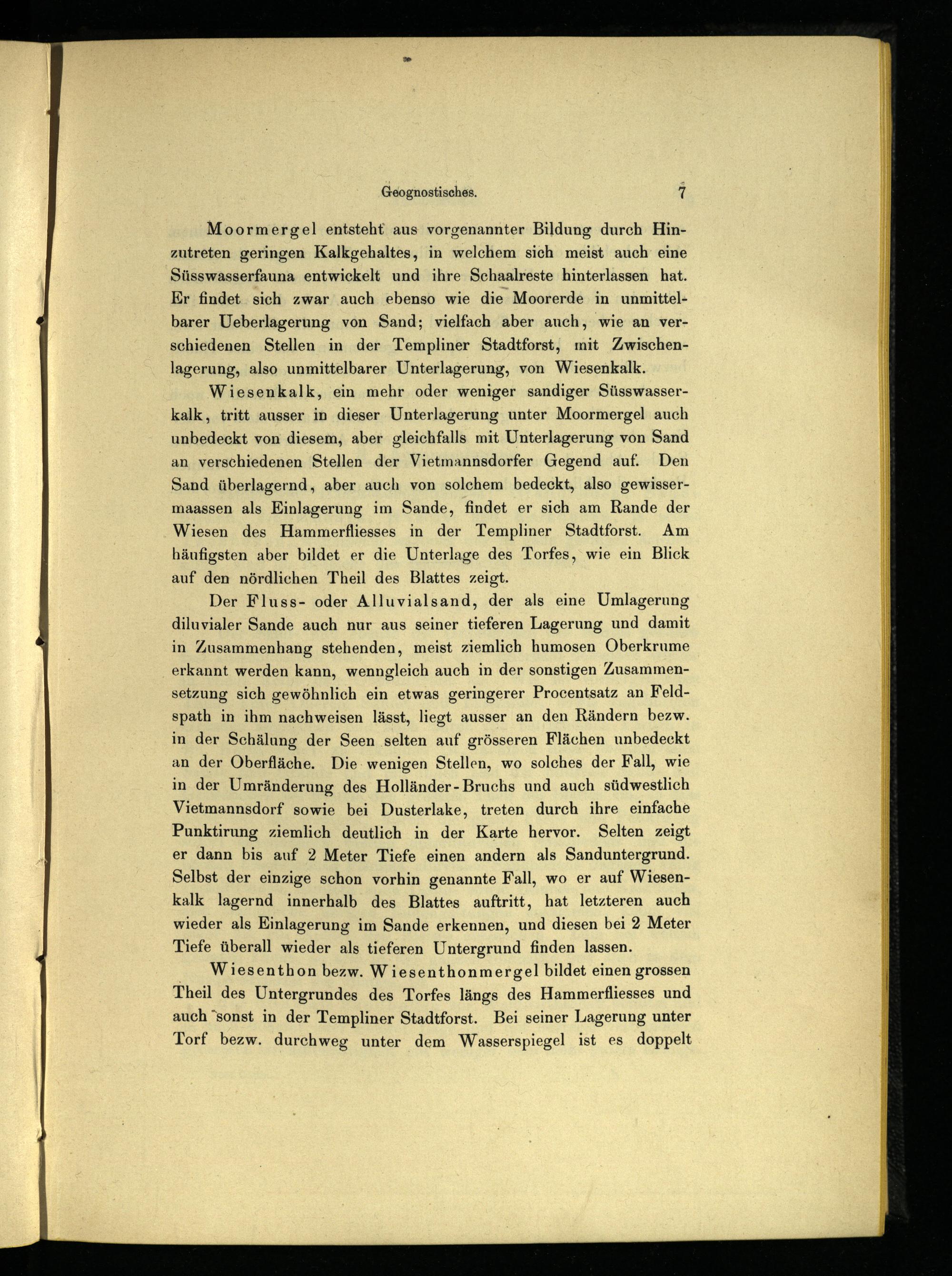 Wiesenkalk, ein mehr oder weniger sandiger Süsswasserkalk, tritt ausser in dieser Unterlagerung unter Moormergel auch unbedeckt von diesem, aber gleichfalls mit Unterlagerung von Sand an verschiedenen Stellen der Vietmannsdorfer Gegend auf. Den Sand überlagernd, aber auch von solchem bedeckt, also gewisser- maassen als Einlagerung im Sande, findet er sich am Rande der Wiesen des Hammerfliesses in der Templiner Stadtforst. Am häufigsten aber bildet er die Unterlage des Torfes, wie ein Blick auf den nördlichen Theil des Blattes zeigt.