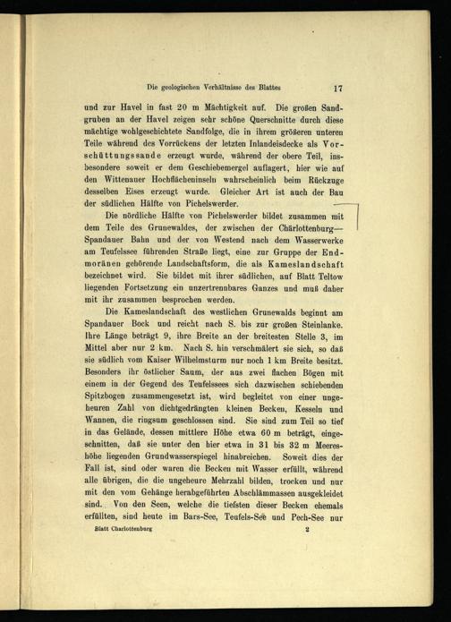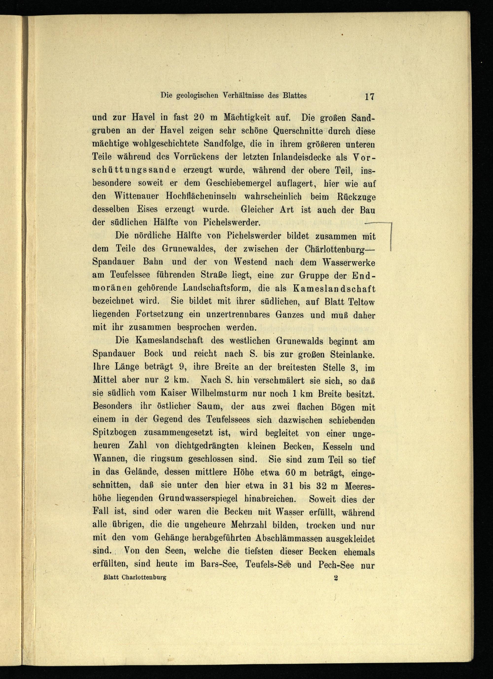 Die Kameslandschaft des westlichen Grunewalds beginnt am Spandauer Bock und reicht nach S. bis zur großen Steinlanke. Ihre Länge beträgt 9, ihre Breite an der breitesten Stelle 3, im Mittel aber nur 2 km. Nach S. hin verschmälert sie sich, so daß sie südlich vom Kaiser Wilhelmsturm nur noch 1 km Breite besitzt. Besonders ihr östlicher Saum, der aus zwei flachen Bögen mit einem in der Gegend des Teufelssees sich dazwischen schiebenden Spitzbogen zusammengesetzt ist, wird begleitet von einer ungeheuren Zahl von dichtgedrängten kleinen Becken, Kesseln und Wannen, die ringsum geschlossen sind. Sie sind zum Teil so tief in das Gelände, dessen mittlere Höhe etwa 60 m beträgt, eingeschnitten, daß sie unter den hier etwa in 31 bis 32 m Meereshöhe liegenden Grundwasserspiegel hinabreichen. Soweit dies der Fall ist, sind oder waren die Becken mit Wasser erfüllt, während alle übrigen, die die ungeheure Mehrzahl bilden, trocken und nur mit den vom Gehänge herabgeführten Abschlämmassen ausgekleidet sind. Von den Seen, welche die tiefsten dieser Becken ehemals erfüllten, sind heute im Bars-See, Teufels-See und Pech-See nur