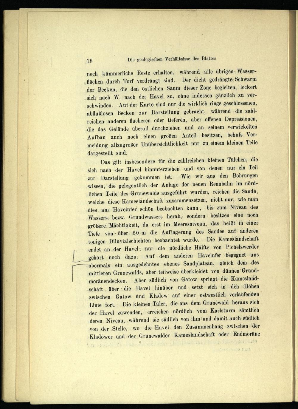 Das gilt insbesondere für die zahlreichen kleinen Tälchen, die sich nach der Havel hinunterziehen und von denen nur ein Teil zur Darstellung gekommen ist. Wie wir aus den Bohrungen wissen,‘die gelegentlich der Anlage der neuen Rennbahn im nördlichen Teile des Grunewalds ausgeführt wurden, reichen die Sande, welche diese Kameslandschaft zusammensetzen, nicht nur, wie man dies am Havelufer schön beobachten kann , bis zum Niveau des Wassers bezw. Grundwassers herab, sondern besitzen eine noch größere. Mächtigkeit, da erst im Meeresniveau, das heißt in einer Tiefe von -über 60 m die Auflagerung des Sandes auf anderen touigen Diluvialschichten beobachtet wurde. Die Kameslandschaft endet an der Havel ; nur die nördliche Hälfte von Picheiswerder gehört noch dazu. Auf dem anderen Havelufer begegnet uns “abermals ein ausgedehntes ebenes Sandplateau, gleich dem des mittleren Grunewalds, aber teilweise überkleidet von dünnen Grundmoränendecken. Aber südlich von Gatow springt die Kamesland- -schaft über die Havel hinüber und setzt sich in den Höhen zwischen Gatow und Kladow auf einer ostwestlich verlaufenden Linie fort. Die kleinen Täler, die aus dem Grunewald heraus sich der Havel zuwenden, erreichen nördlich vom Karlsturm sämtlich deren Niveau, während sie südlich von ihm und damit auch südlich von der Stelle, wo die Havel den Zusammenhang zwischen der Kladower und der Grunewalder Kameslandschaft oder Endmoräne