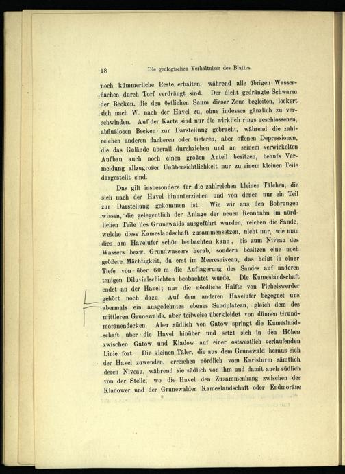noch kümmerliche Reste erhalten, während alle übrigen Wasserflächen durch Torf verdrängt sind. Der dicht gedrängte Schwarm der Becken, die den östlichen Saum dieser Zone begleiten, lockert sich nach W. nach der Havel zu, ohne indessen gänzlich zu verschwinden. Auf der Karte sind nur die wirklich rings geschlossenen, abflußlosen Becken • zur Darstellung gebracht, während die zahlreichen anderen flacheren oder tieferen, aber offenen Depressionen, die das Gelände überall durchziehen und an seinem verwickelten Aufbau auch noch einen großen Anteil besitzen, behufs Vermeidung allzugroßer Unübersichtlichkeit nur zu einem kleinen Teile dargestellt sind.