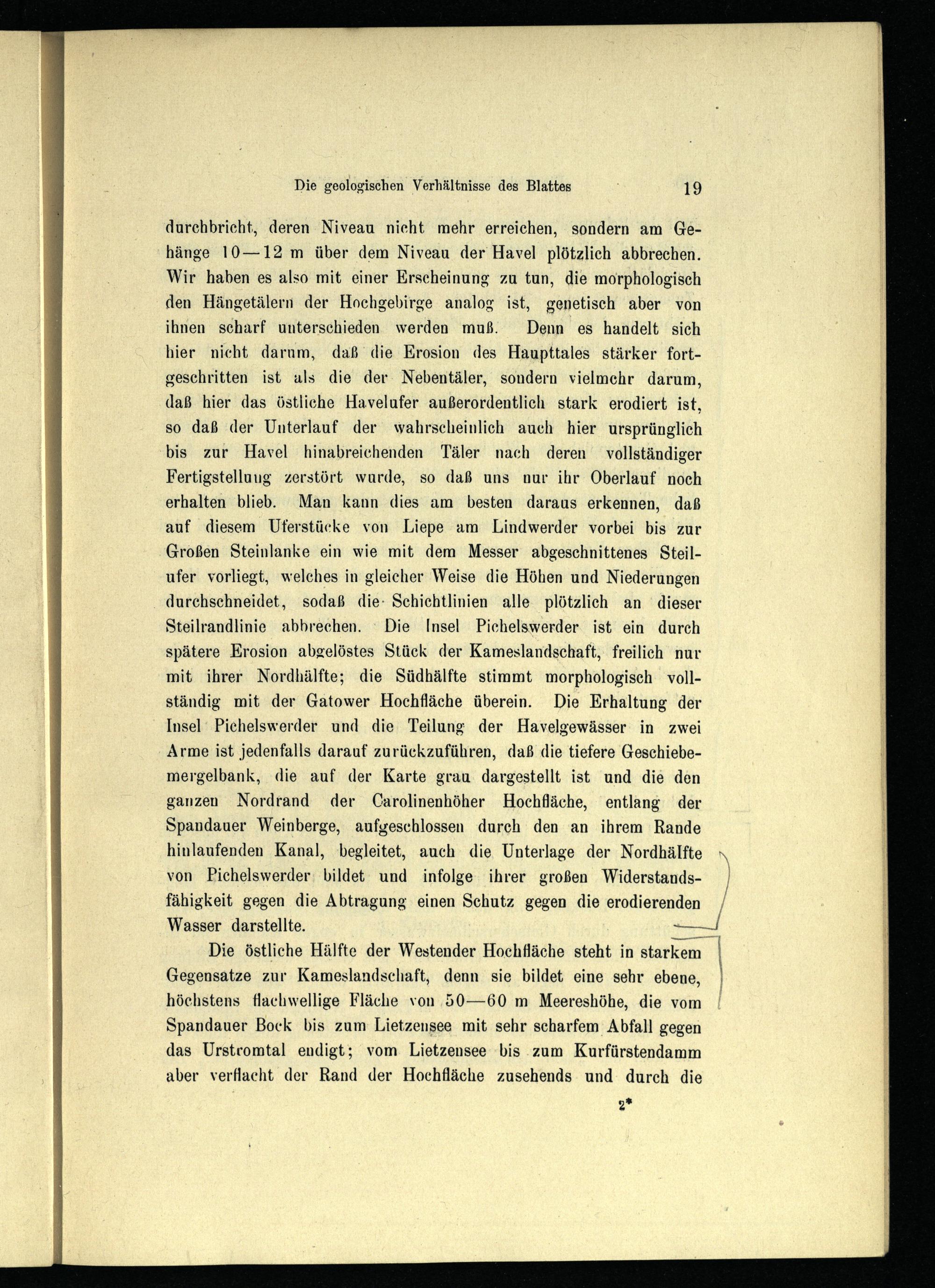 durchbricht, deren Niveau nicht mehr erreichen, sondern am Gehänge 10 —12 m über dem Niveau der Havel plötzlich abbrechen. Wir haben es also mit einer Erscheinung zu tun, die morphologisch den Hängetälern der Hochgebirge analog ist, genetisch aber von ihnen scharf unterschieden werden muß. Denn es handelt sich hier nicht darum, daß die Erosion des Haupttales stärker fortgeschritten ist als die der Nebentäler, sondern vielmehr darum, daß hier das östliche Havelufer außerordentlich stark erodiert ist, so daß der Unterlauf der wahrscheinlich auch hier ursprünglich bis zur Havel hinabreichenden Täler nach deren vollständiger Fertigstellung zerstört wurde, so daß uns nur ihr Oberlauf noch erhalten blieb. Man kann dies am besten daraus erkennen, daß auf diesem Uferstücke von Liepe am Lindwerder vorbei bis zur Großen Steinlanke ein wie mit dem Messer abgeschnittenes Steilufer vorliegt, welches in gleicher Weise die Höhen und Niederungen durchschneidet, sodaß die- Schichtlinien alle plötzlich an dieser Steilrandlinie abbrechen. Die Insel Pichelswerder ist ein durch spätere Erosion abgelöstes Stück der Kameslandschaft, freilich nur mit ihrer Nordhälfte; die Südhälfte stimmt morphologisch vollständig mit der Gatower Hochfläche überein. Die Erhaltung der Insel Pichelswerder und die Teilung der Havelgewässer in zwei Arme ist jedenfalls darauf zurückzuführen, daß die tiefere Geschiebemergelbank, die auf der Karte grau dargestellt ist und die den ganzen Nordrand der Carolinenhöher Hochfläche, entlang der Spandauer Weinberge, aufgeschlossen durch den an ihrem Rande hinlaufenden Kanal, begleitet, auch die Unterlage der Nordhälfte * von Pichelswerder bildet und infolge ihrer großen Widerstandsfähigkeit gegen die Abtragung einen Schutz gegen die erodierenden y