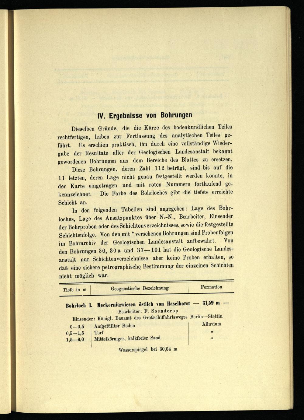Dieselben Gründe, die die Kürze des bodenkundlichen Teiles rechtfertigen, haben zur Fortlassung des analytischen Teiles geführt. Es erschien praktisch, ihn durch eine vollständige Wiedergabe der Resultate aller der Geologischen Landesanstalt bekannt gewordenen Bohrungen aus dem Bereiche des Blattes zu ersetzen.