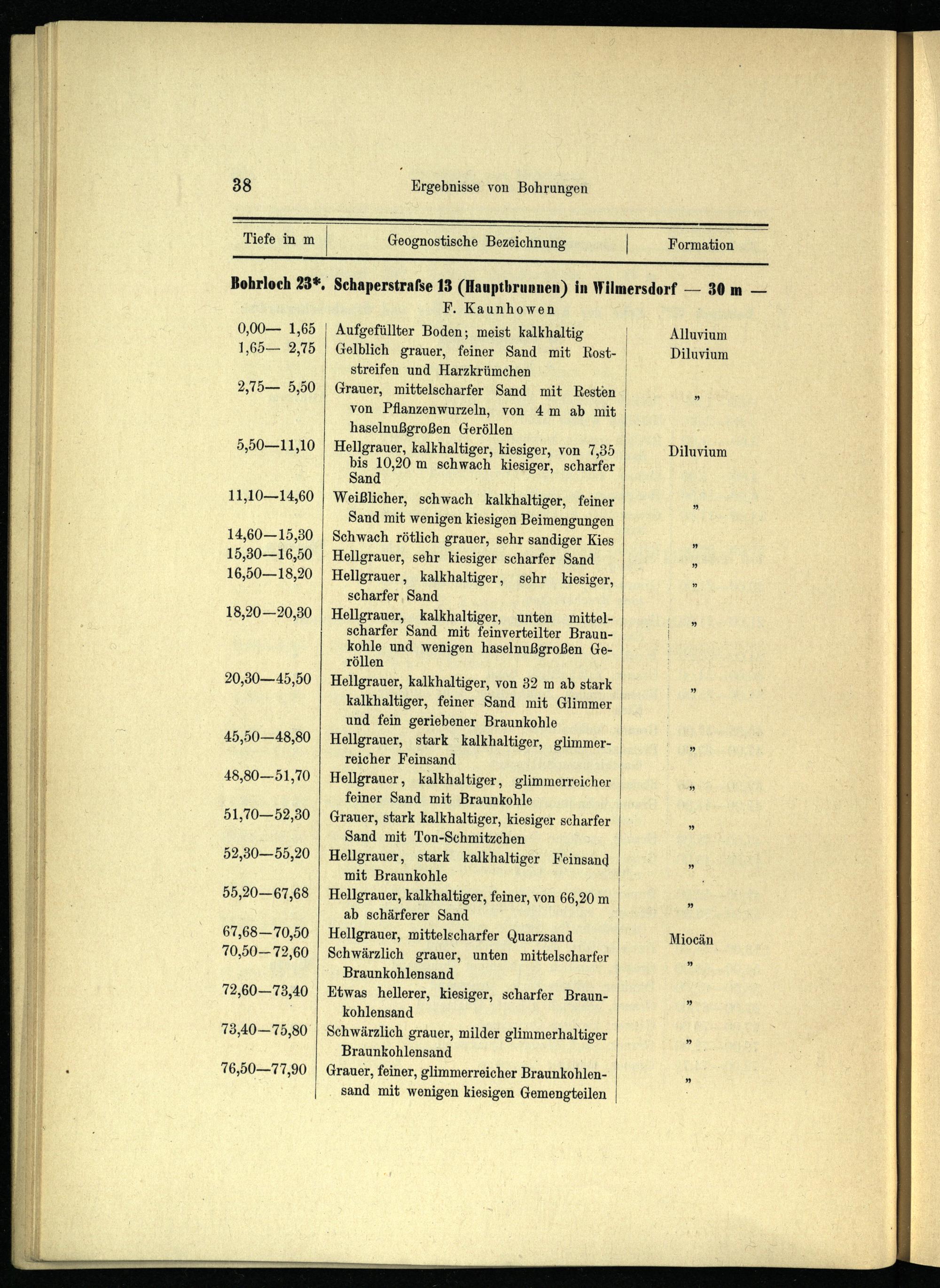 Aufgefüllter Boden; meist kalkhaltig Gelblich grauer, feiner Sand mit Koststreifen und Harzkrümchen Grauer, mittelscharfer Sand mit Kesten j von Pflanzenwurzeln, von 4 m ah mit haselnußgroßen Gerollen Hellgrauer, kalkhaltiger, kiesiger, von 7,35 bis 10,20 m schwach kiesiger, scharfer Sand