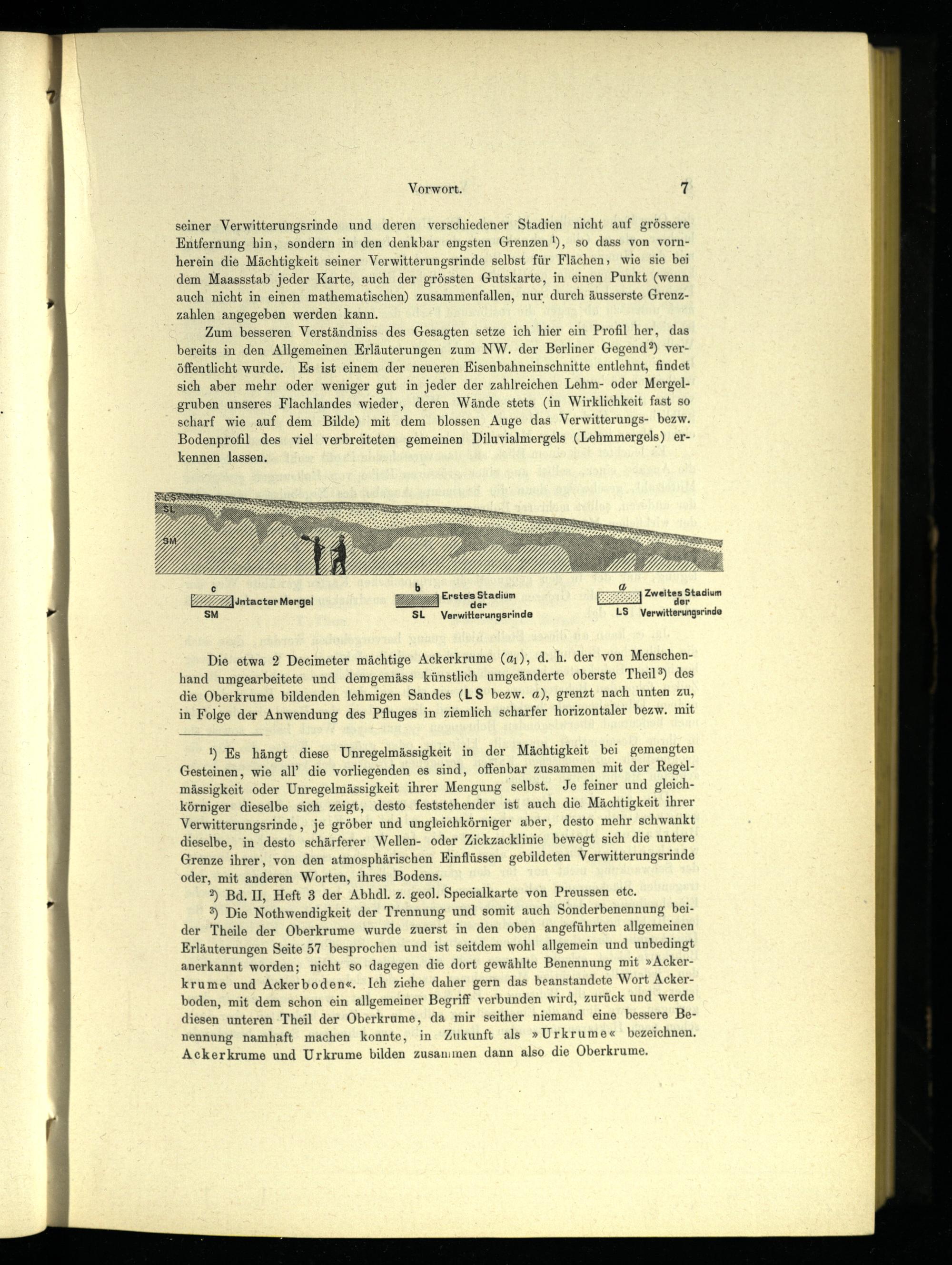 seiner Verwitterungsrinde und deren verschiedener Stadien nicht auf grössere Entfernung hin, sondern in den denkbar engsten Grenzen 1 ), so dass von vornherein die Mächtigkeit seiner Verwitterungsrinde selbst für Flächen, wie sie bei dem Maassstab jeder Karte, auch der grössten Gutskarte, in einen Punkt (wenn auch nicht in einen mathematischen) zusammenfallen, nur durch äusserste Grenzzahlen angegeben werden kann.