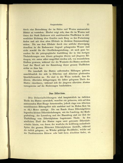 durch eine Betrachtung der im Süden und Westen anstossenden Blätter zu verstehen. Hierbei zeigt sich, dass die im Westen und Osten der Stadt Rathenow sich ausdehnenden Thalflächen in südwestlicher Richtung über Genthin nach Burg zu ihre Fortsetzung finden und mit dem alten Elbthale in direktem Zusammenhänge stehen. Die aus dem Elbthale durch eine seitliche Abzweigung desselben in die Rathenower Gegend gelangenden Wasser sind nicht sowohl für die Oberflächengestaltung, als auch ganz besonders für die petrographische Ausbildung der in den dortigen Thalniederungen zum Absatz gelangten älteren und jüngeren Bildungen, wie unten näher ausgeführt werden soll, von wesentlichem Einfluss gewesen, während der die Westseite des Blattes streifende Lauf der Havel mit der Entstehung dieser grossen Thalflächen nichts zu thun hat.