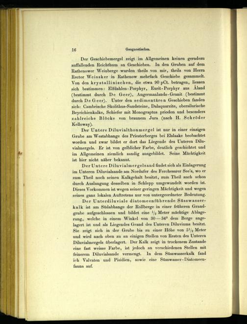 Der Geschiebemergel zeigt im Allgemeinen keinen geradezu auffallenden Reichthum an Geschieben. In den Gruben auf dem Rathenower Weinberge wurden theils von mir, theils von Herrn Rector Weissker in Rathenow mehrfach Geschiebe gesammelt. Von den krystallinischen, die etwa 90 pCt. betragen, Hessen sich bestimmen: Elfdahlen-Porphyr, Eurit-Porphyr aus Aland (bestimmt durch De Geer ), Angermanlands-Granit (bestimmt durch De Geer ). Unter den sedimentären Geschieben fanden sich: Cambrische Skolithus-Sandsteine, Dalaquarzite, obersilurische Beyrichienkalke, Schiefer mit Monograptus priodon und besonders zahlreiche Blöcke von braunem Jura (nach H. Schröder Kelloway).