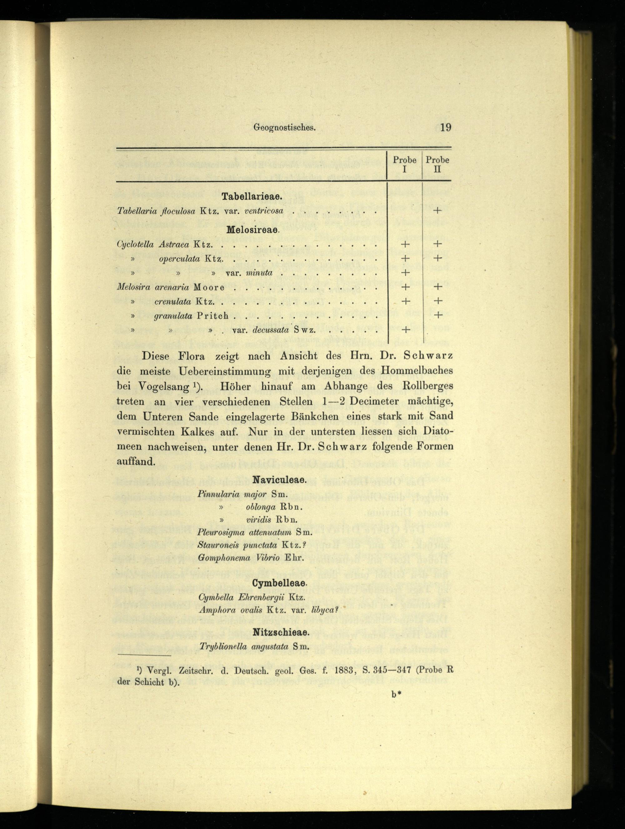 Diese Flora zeigt nach Ansicht des Hrn. Dr. Schwarz die meiste Uebereinstimmung mit derjenigen des Hommelbaches bei Vogelsang *). Höher hinauf am Abhange des Rollberges treten an vier verschiedenen Stellen 1—2 Decimeter mächtige, dem Unteren Sande eingelagerte Bänkchen eines stark mit Sand vermischten Kalkes auf. Nur in der untersten Hessen sich Diatomeen nachweisen, unter denen Hr. Dr. Schwarz folgende Formen auffand.