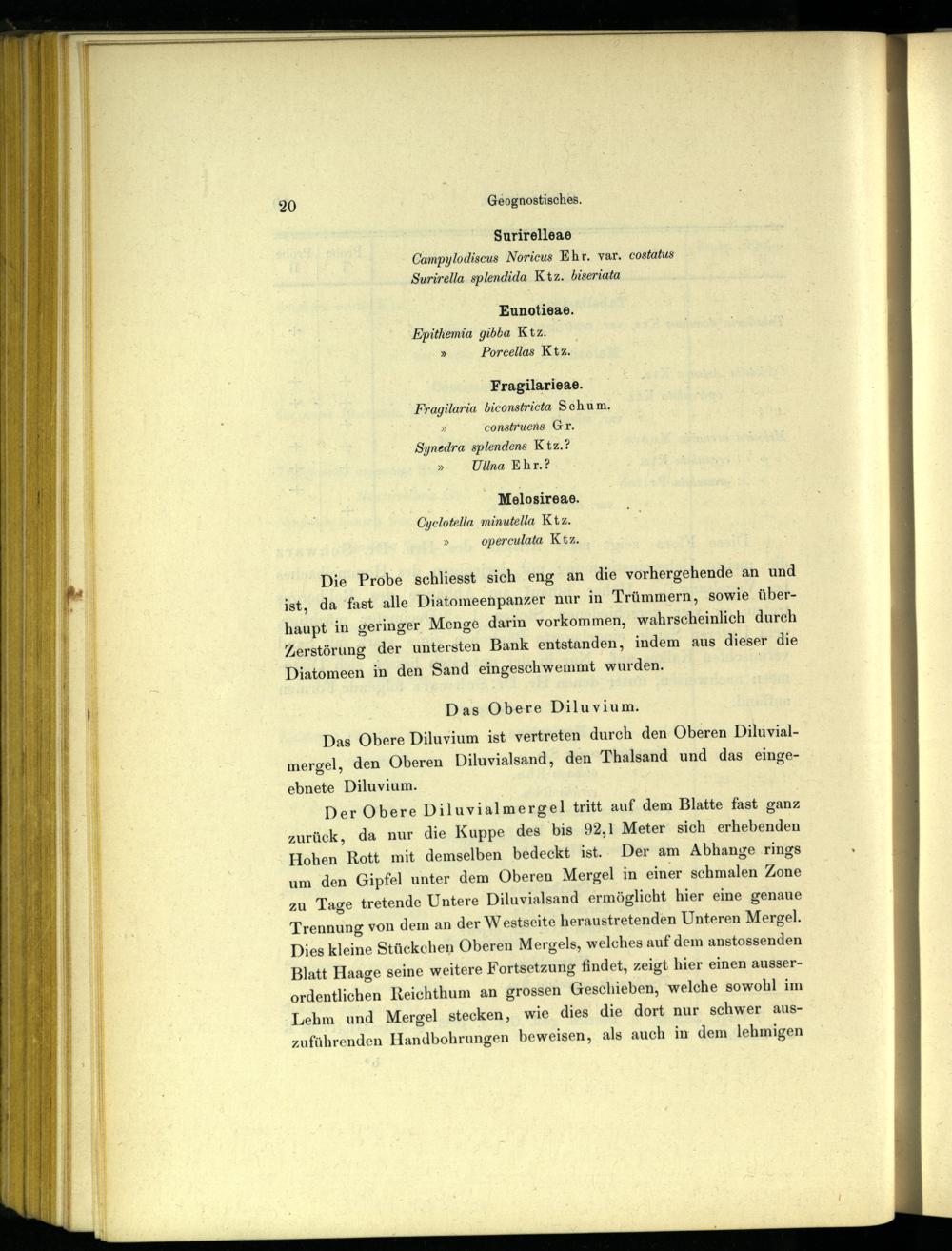 Der Obere Diluvialmergel tritt auf dem Blatte fast ganz zurück, da nur die Kuppe des bis 92,1 Meter sich erhebenden Hohen Rott mit demselben bedeckt ist. Der am Abhange rings um den Gipfel unter dem Oberen Mergel in einer schmalen Zone zu Tage tretende Untere Diluvialsand ermöglicht hier eine genaue Trennung von dem an der Westseite heraustretenden Unteren Mergel. Dies kleine Stückchen Oberen Mergels, welches auf dem anstossenden Blatt Haage seine weitere Fortsetzung findet, zeigt hier einen ausserordentlichen Reichthum an grossen Geschieben, welche sowohl im Lehm und Mergel stecken, wie dies die dort nur schwer auszuführenden Handbohrungen beweisen, als auch in dem lehmigen