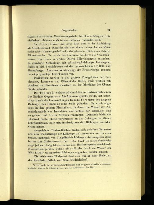 Der Thalsand, welcher bei den früheren Kartenaufnahmen in der Berliner Gegend zum Alt-Alluvium gestellt wurde, hat neuerdings durch die Untersuchungen Berendt’s 1 ) unter den jüngsten Bildungen des Diluviums seine Stelle gefunden. Er wurde abgesetzt in den grossen Flussthälern, in denen die Wasser der Abschmelzperiode des Inlandeises am Schluss der Glacialzeit sich zu grossen und breiten Strömen vereinigten. Demnach bildet der Thalsand flache, ebene Vorterrassen an den Gehängen der älteren Diluvialplateaus, oder tritt inselartig aus den Bildungen des Alluviums heraus.
