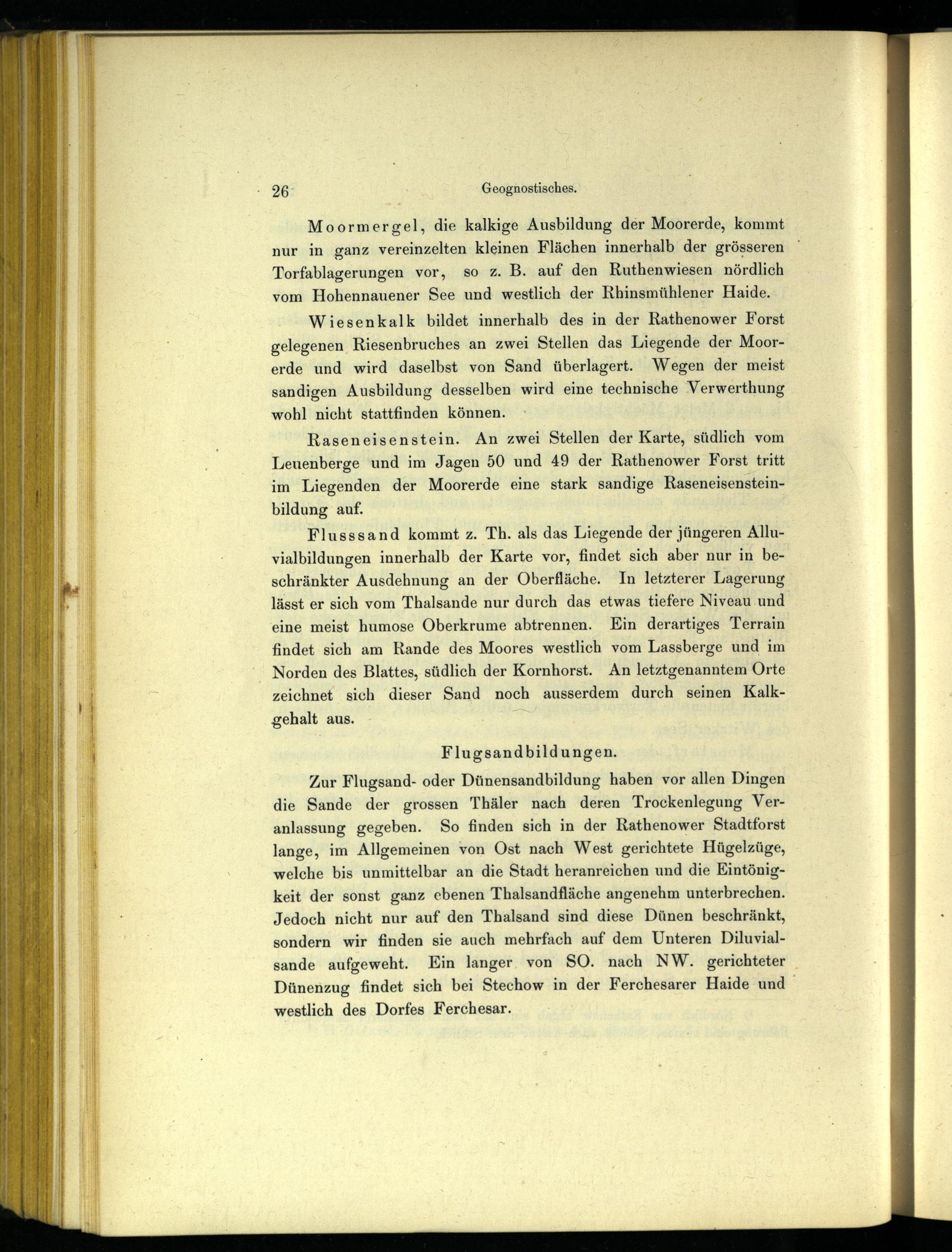 Zur Flugsand- oder Dünensandbildung haben vor allen Dingen die Sande der grossen Thäler nach deren Trockenlegung Veranlassung gegeben. So finden sich in der Rathenower Stadtforst lange, im Allgemeinen von Ost nach West gerichtete Hügelzüge, welche bis unmittelbar an die Stadt heranreichen und die Eintönigkeit der sonst ganz ebenen Thalsandfläche angenehm unterbrechen. Jedoch nicht nur auf den Thalsand sind diese Dünen beschränkt, sondern wir finden sie auch mehrfach auf dem Unteren Diluvialsande aufgeweht. Ein langer von SO. nach NW. gerichteter Dünenzug findet sich bei Stechow in der Ferchesarer Haide und westlich des Dorfes Ferchesar .