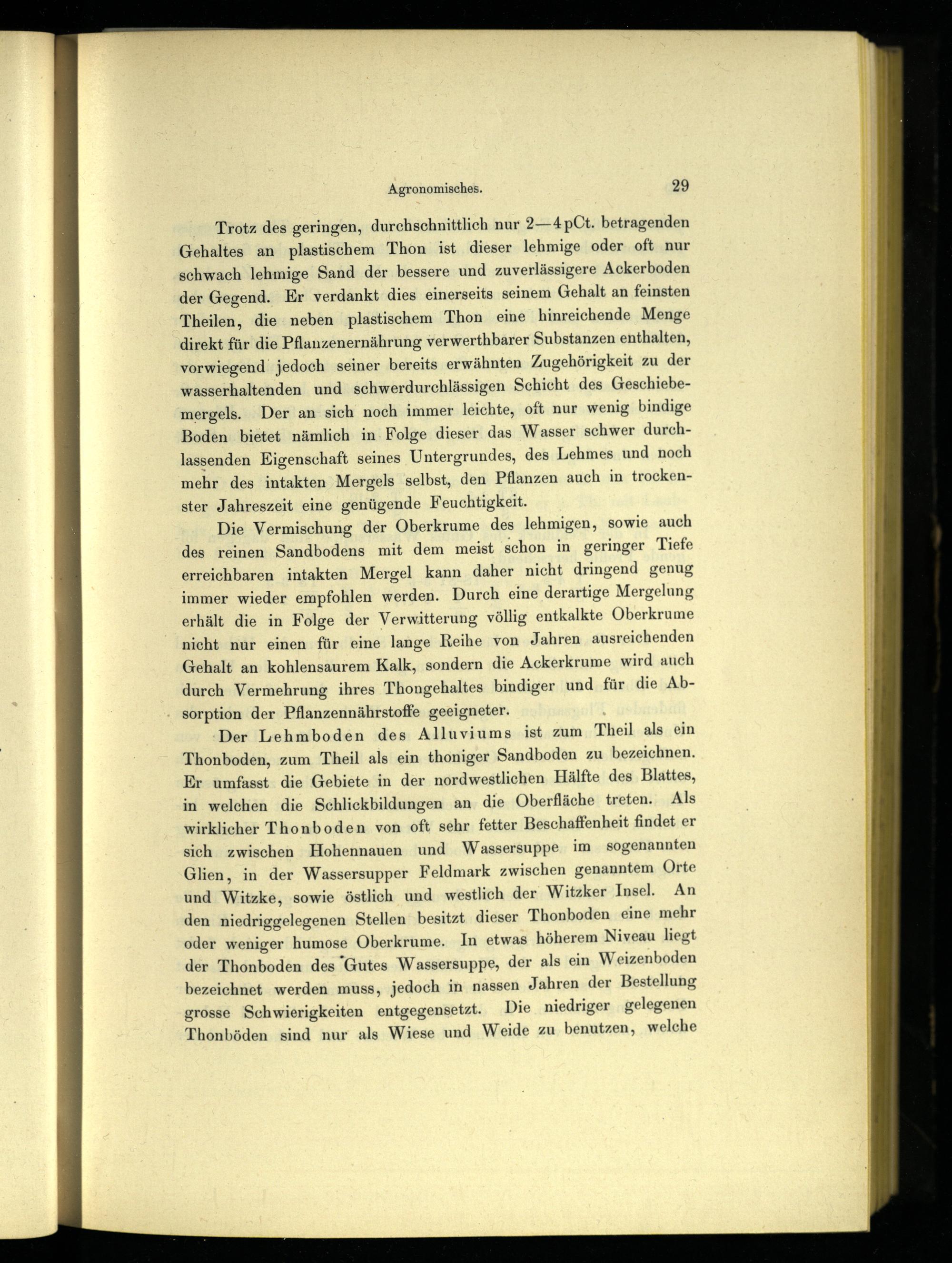 Trotz des geringen, durchschnittlich nur 2—4pCt. betragenden Gehaltes an plastischem Thon ist dieser lehmige oder oft nur schwach lehmige Sand der bessere und zuverlässigere Ackerboden der Gegend. Er verdankt dies einerseits seinem Gehalt an feinsten Theilen, die neben plastischem Thon eine hinreichende Menge direkt für die Pflanzenernährung verwerthbarer Substanzen enthalten, vorwiegend jedoch seiner bereits erwähnten Zugehörigkeit zu der wasserhaltenden und schwerdurchlässigen Schicht des Geschiebemergels. Der an sich noch immer leichte, oft nur wenig bindige Boden bietet nämlich in Folge dieser das Wasser schwer durchlassenden Eigenschaft seines Untergrundes, des Lehmes und noch mehr des intakten Mergels selbst, den Pflanzen auch in trockenster Jahreszeit eine genügende Feuchtigkeit.