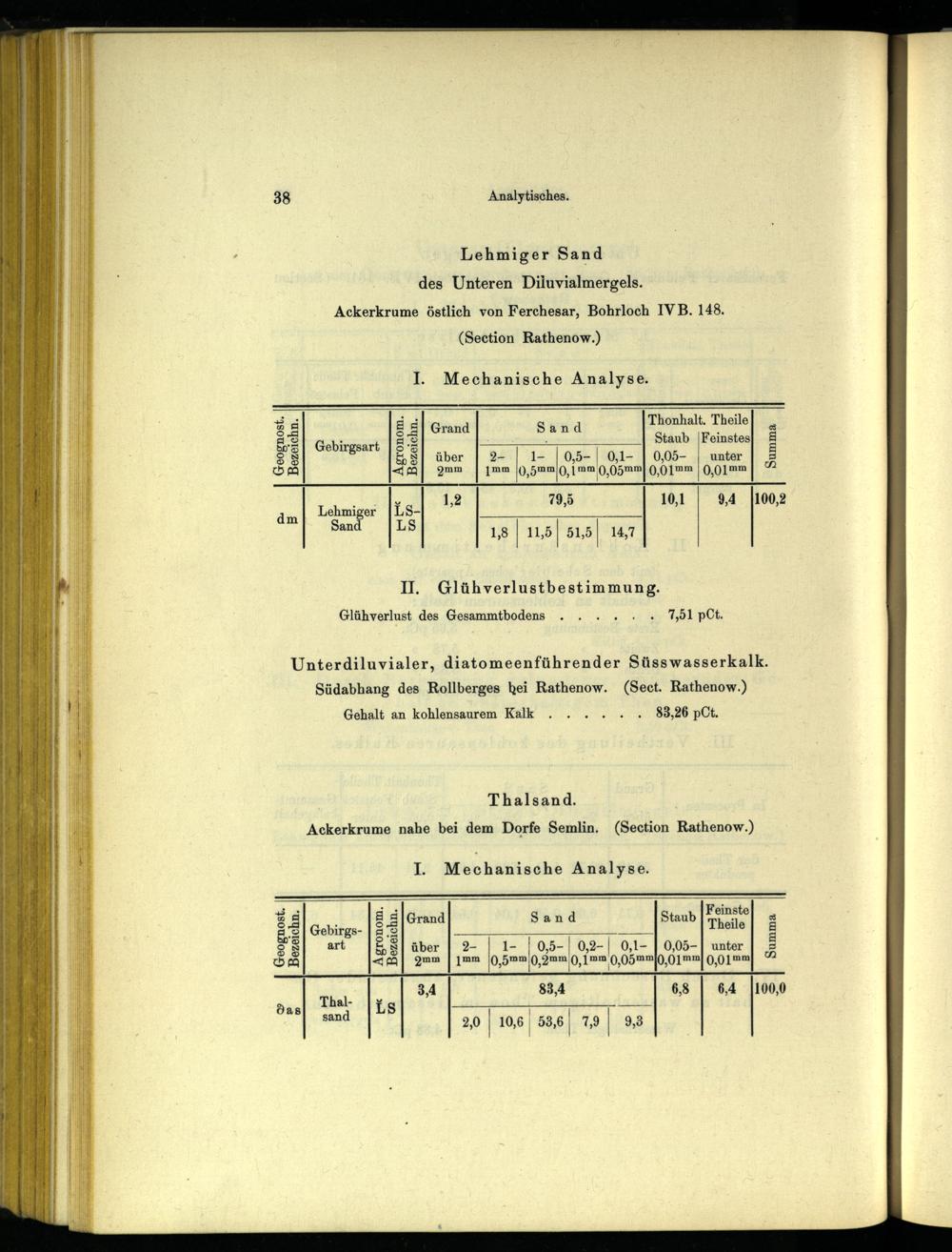 Unterdiluvialer, diatomeenführender Süsswasserkalk. Südabhang des Rollberges hei Rathenow . (Sect. Rathenow .) Gehalt an kohlensaurem Kalk. 83,26 pCt.