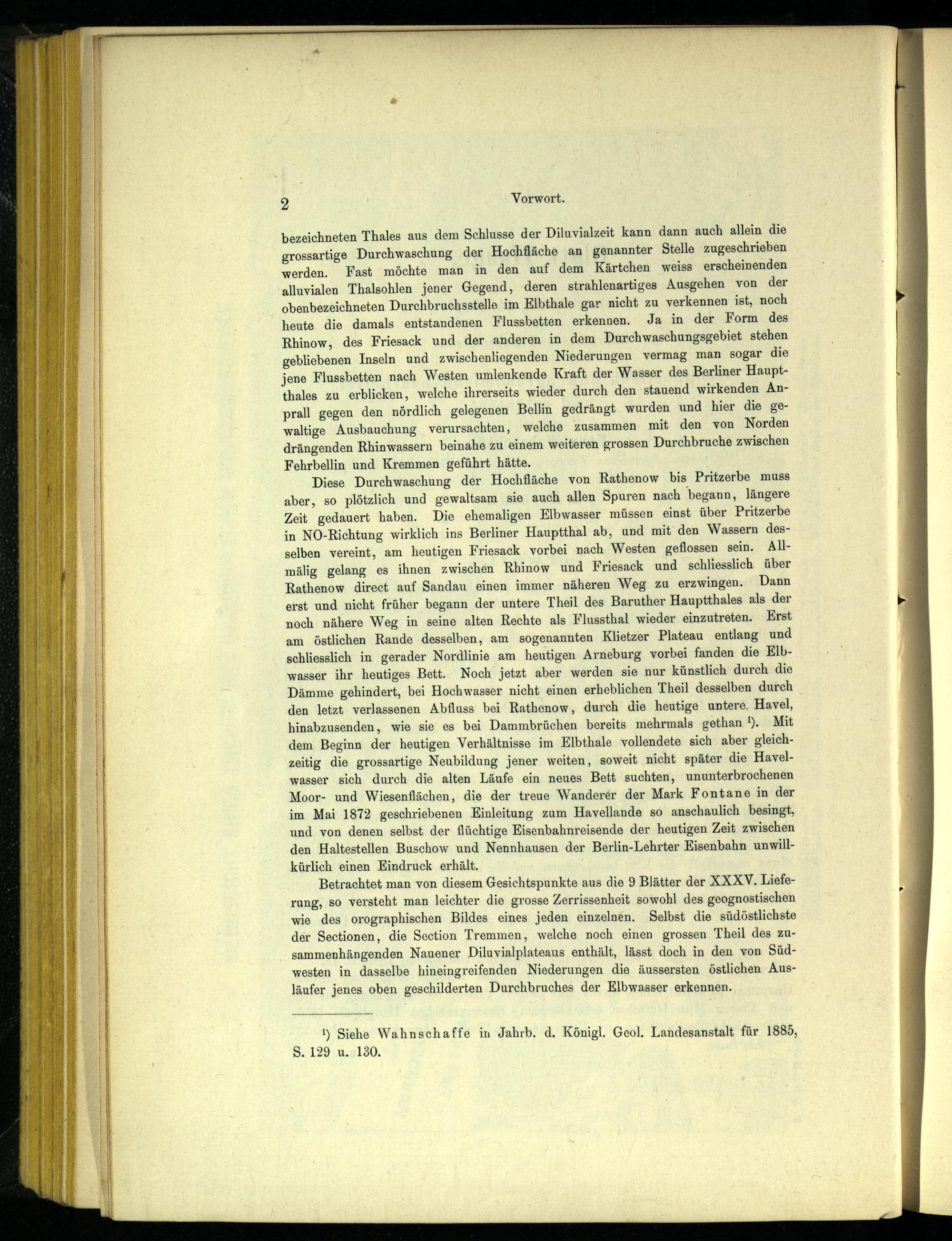 Diese Durchwaschung der Hochfläche von Rathenow bis Pritzerbe muss aber, so plötzlich und gewaltsam sie auch allen Spuren nach begann, längere Zeit gedauert haben. Die ehemaligen Elbwasser müssen einst über Pritzerbe in NO-Richtung wirklich ins Berliner Hauptthal ab, und mit den Wassern desselben vereint, am heutigen Friesack vorbei nach Westen geflossen sein. All- mälig gelang es ihnen zwischen Rhinow und Friesack und schliesslich über Rathenow direct auf Sandau einen immer näheren Weg zu erzwingen. Dann erst und nicht früher begann der untere Theil des Baruther Hauptthaies als der noch nähere Weg in seine alten Rechte als Flussthal wieder einzutreten. Erst am östlichen Rande desselben, am sogenannten Klietzer Plateau entlang und schliesslich in gerader Nordlinie am heutigen Arneburg vorbei fanden die Elbwasser ihr heutiges Bett. Noch jetzt aber werden sie nur künstlich durch die Dämme gehindert, bei Hochwasser nicht einen erheblichen Theil desselben durch den letzt verlassenen Abfluss bei Rathenow , durch die heutige untere. Havel , hinabzusenden, wie sie es bei Dammbrüchen bereits mehrmals gethan '). Mit dem Beginn der heutigen Verhältnisse im Elbthale vollendete sich aber gleichzeitig die grossartige Neubildung jener weiten, soweit nicht später die Havelwasser sich durch die alten Läufe ein neues Bett suchten, ununterbrochenen Moor- und Wiesenflächen, die der treue Wanderer der Mark Fontane in der im Mai 1872 geschriebenen Einleitung zum Havellande so anschaulich besingt, und von denen selbst der flüchtige Eisenbahnreisende der heutigen Zeit zwischen den Haltestellen Buschow und Nennhausen der Berlin-Lehrter Eisenbahn unwillkürlich einen Eindruck erhält.