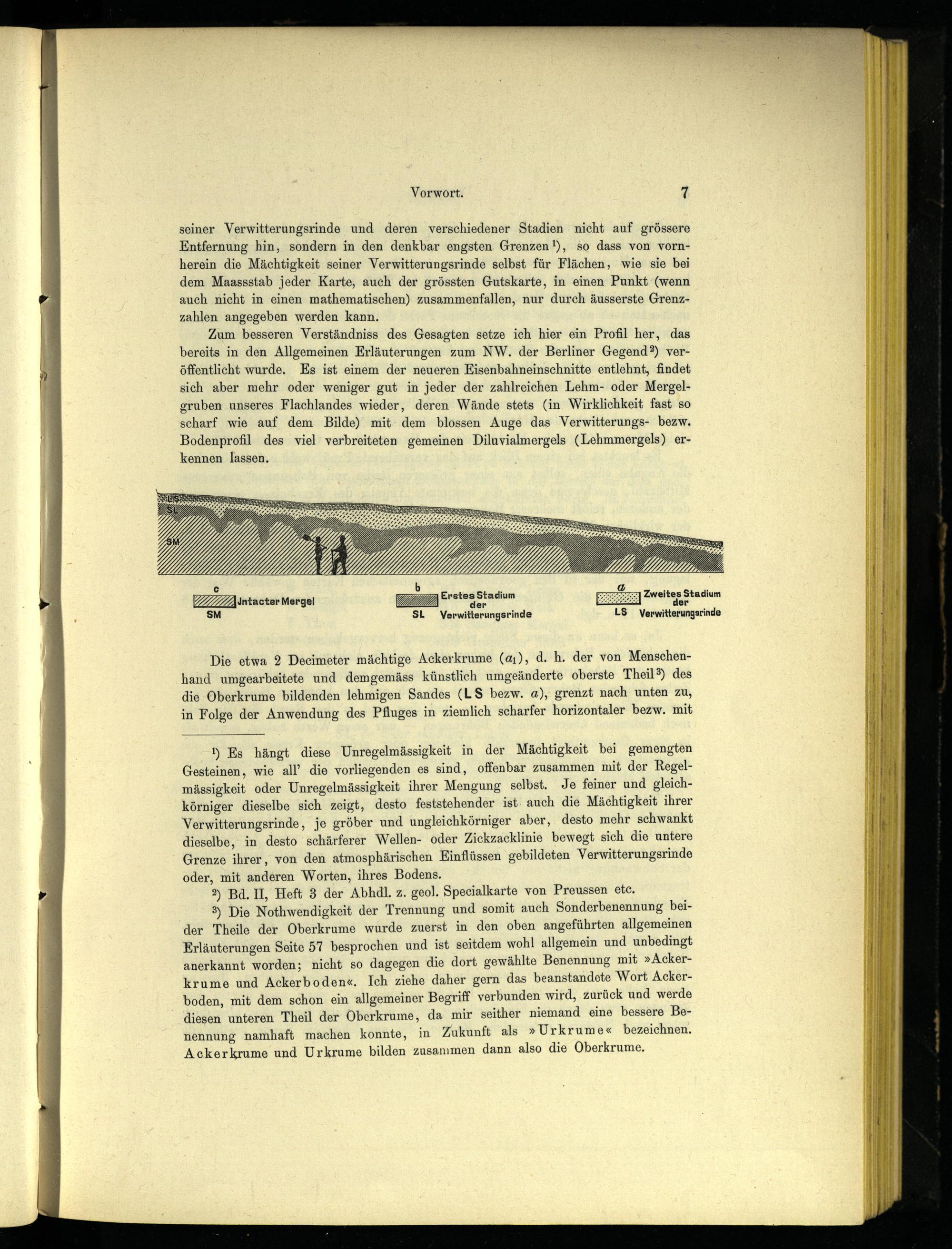3 ) Die Nothwendigkeit der Trennung und somit auch Sonderbenennung beider Theile der Oberkrume wurde zuerst in den oben angeführten allgemeinen Erläuterungen Seite 57 besprochen und ist seitdem wohl allgemein und unbedingt anerkannt worden; nicht so dagegen die dort gewählte Benennung mit »Ackerkrume und Ackerboden«. Ich ziehe daher gern das beanstandete Wort Ackerboden, mit dem schon ein allgemeiner Begriff verbunden wird, zurück und werde diesen unteren Theil der Oberkrume, da mir seither niemand eine bessere Benennung namhaft machen konnte, in Zukunft als »Urkrume« bezeichnen. Ackerkrume und Urkrume bilden zusammen dann also die Oberkrume.