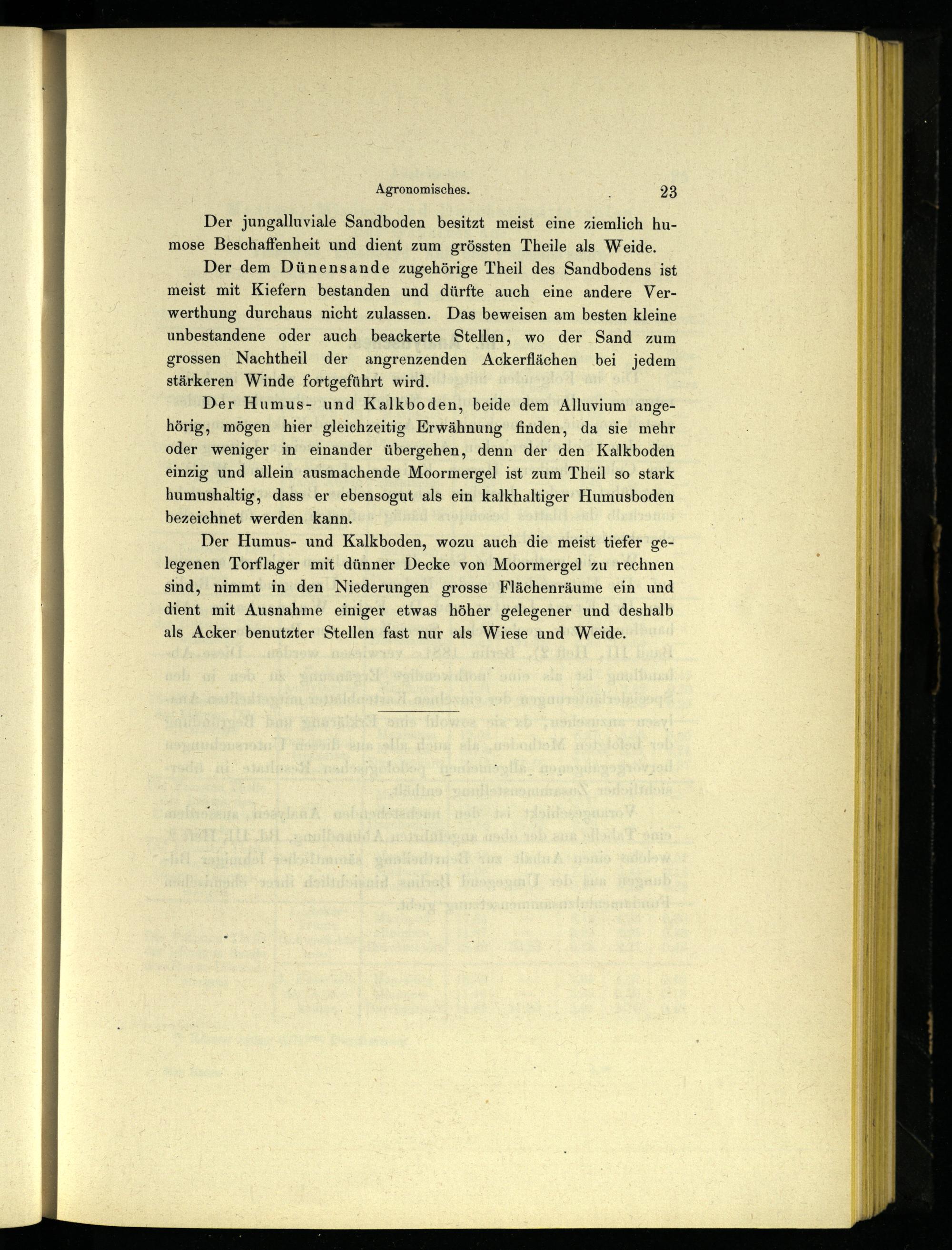Der Humus- und Kalkboden, beide dem Alluvium angehörig, mögen hier gleichzeitig Erwähnung finden, da sie mehr oder weniger in einander übergehen, denn der den Kalkboden einzig und allein ausmachende Moormergel ist zum Theil so stark humushaltig, dass er ebensogut als ein kalkhaltiger Humusboden bezeichnet werden kann.