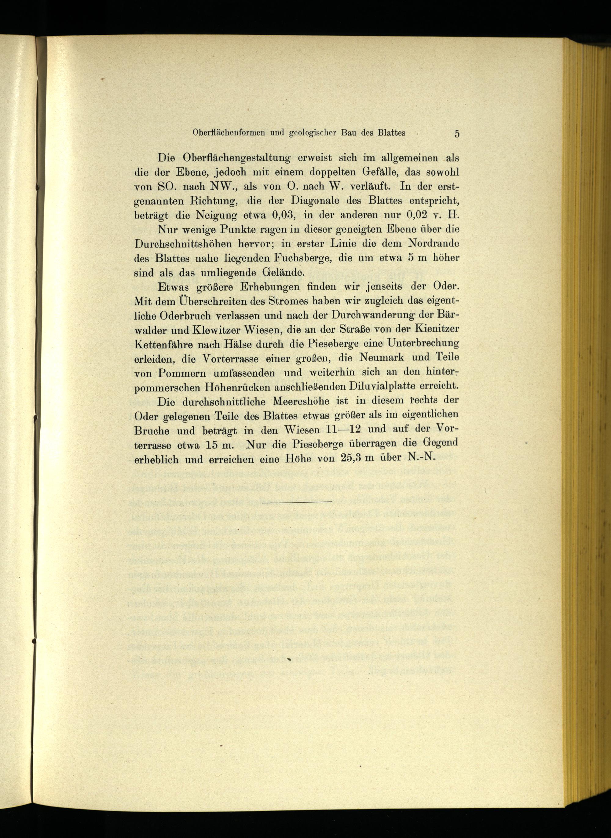 Die durchschnittliche Meereshöhe ist in diesem rechts der Oder gelegenen Teile des Blattes etwas größer als im eigentlichen Bruche und beträgt in den Wiesen 11—12 und auf der Vorterrasse etwa 15 m. Nur die Pieseberge überragen die Gegend erheblich und erreichen eine Höhe von 25,3 m über N.-N.