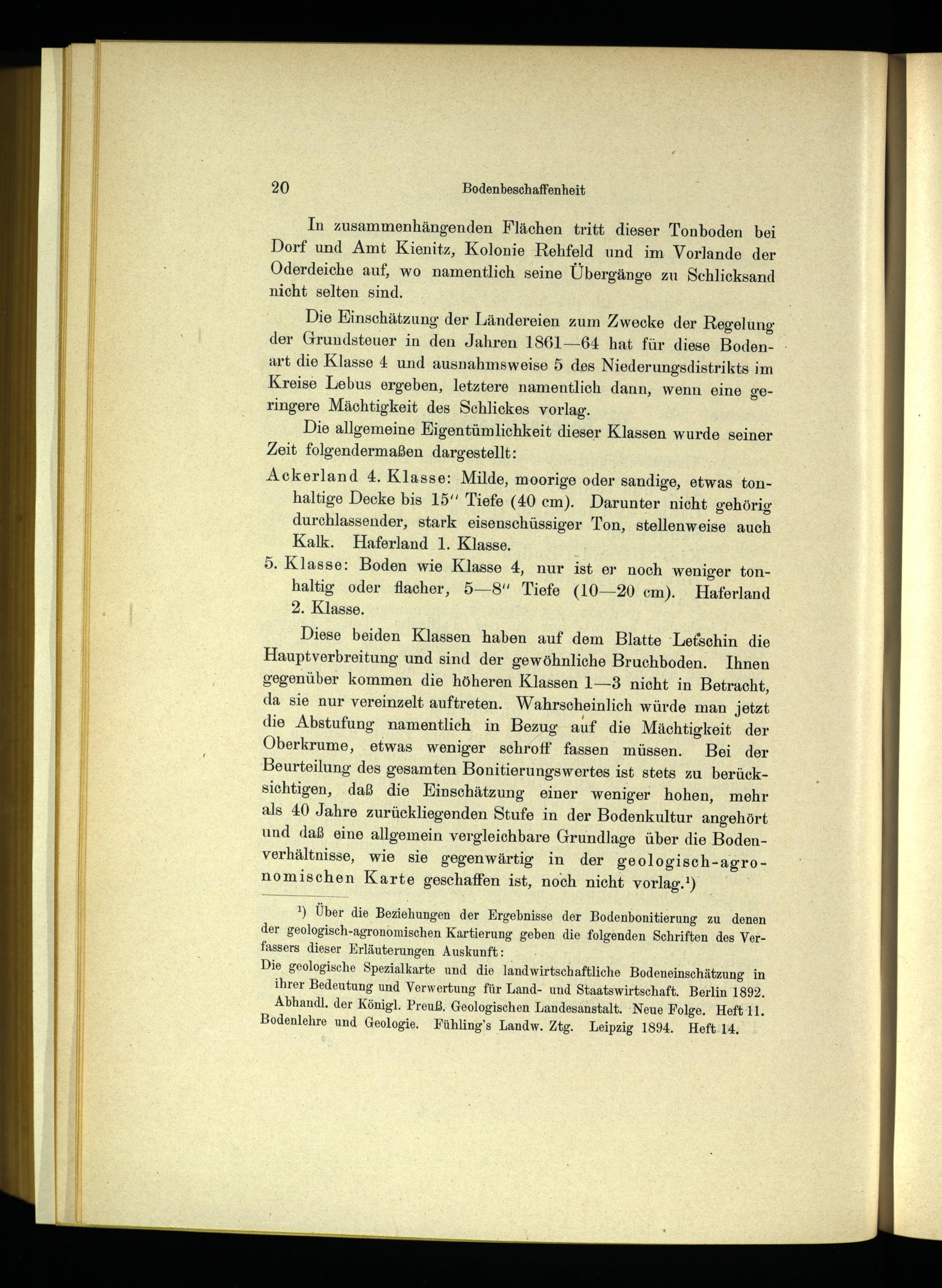 Diese beiden Klassen haben auf dem Blatte Letschin die Hauptverbreitung und sind der gewöhnliche Bruchboden. Ihnen gegenüber kommen die höheren Klassen 1—3 nicht in Betracht, da sie nur vereinzelt auftreten. Wahrscheinlich würde man jetzt die Abstufung namentlich in Bezug auf die Mächtigkeit der Oberkrume, etwas weniger schroff fassen müssen. Bei der Beurteilung des gesamten Bonitierungswertes ist stets zu berücksichtigen, daß die Einschätzung einer weniger hohen, mehr als 40 Jahre zurückliegenden Stufe in der Bodenkultur angehört und daß eine allgemein vergleichbare Grundlage über die Bodenverhältnisse, wie sie gegenwärtig in der geologisch-agronomischen Karte geschaffen ist, noch nicht vorlag. 1 )
